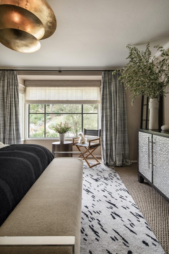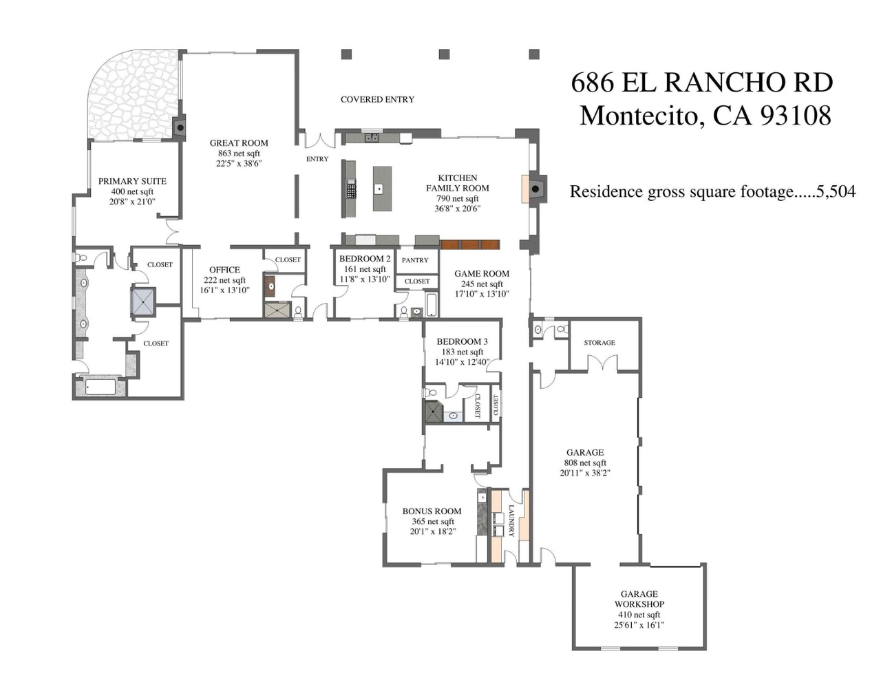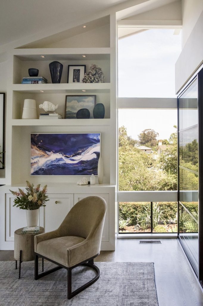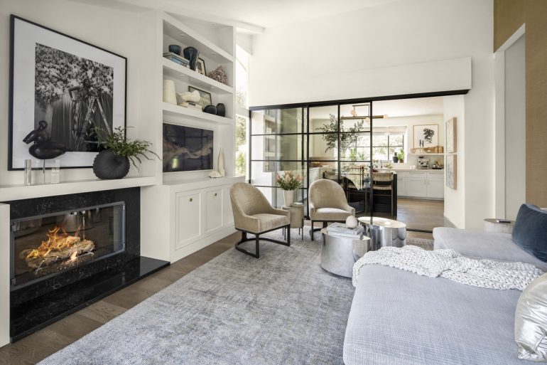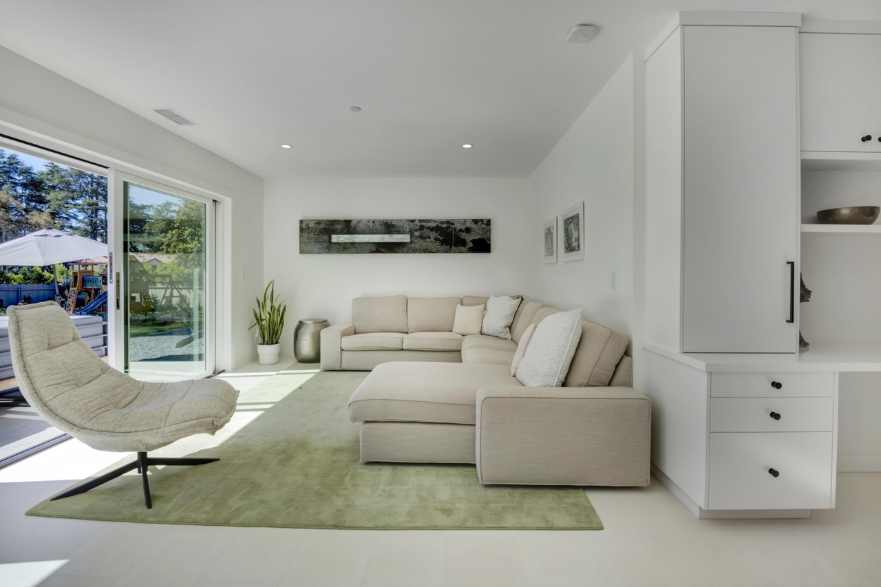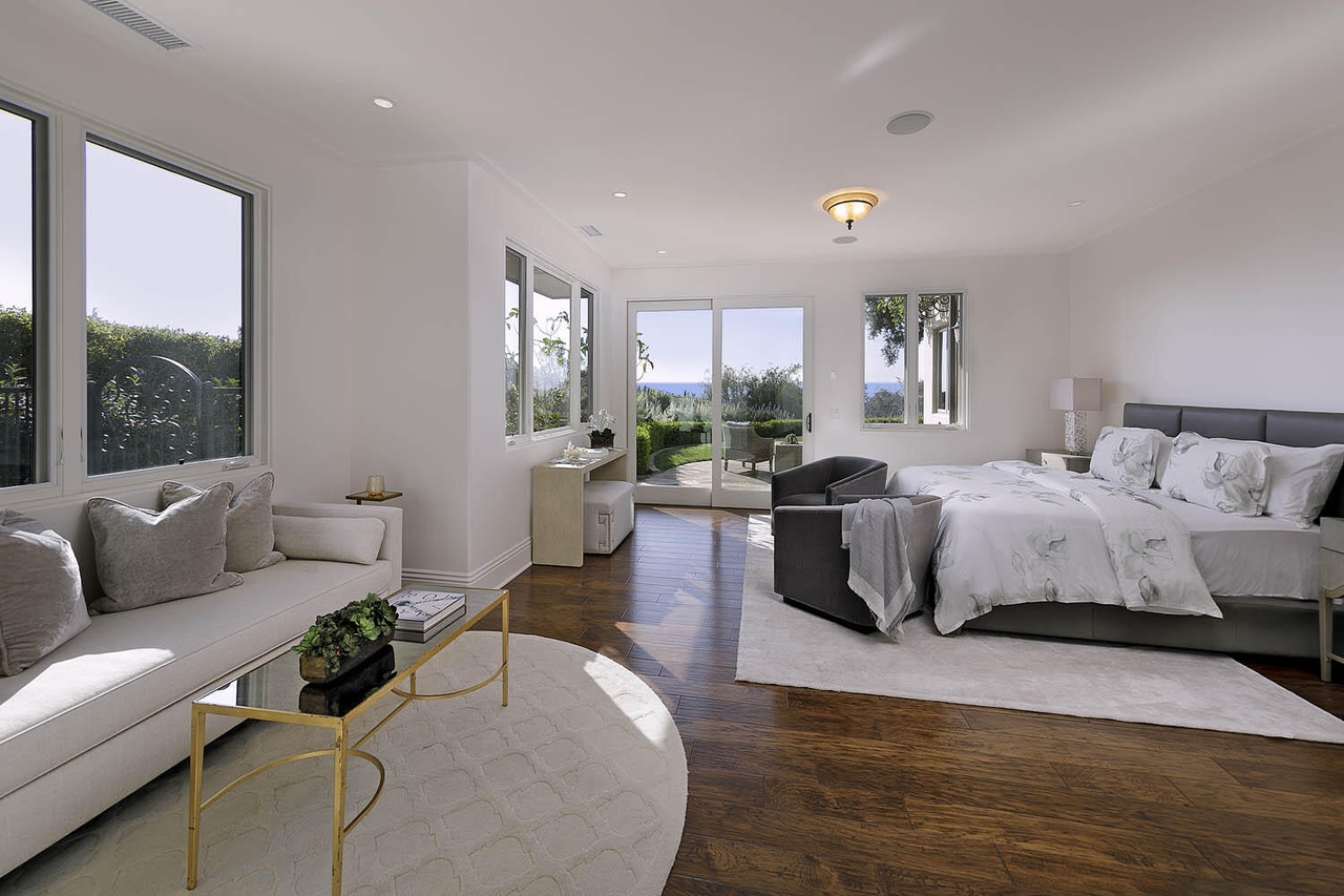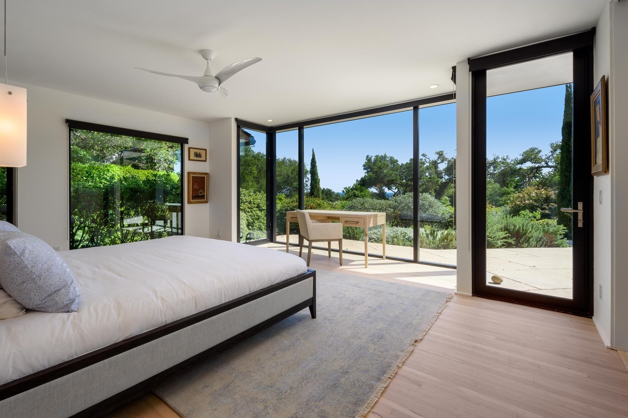 Built in 2010, 686 El Rancho Road ($7.75 million) has just three bedrooms but a bunch of other rooms: game room, office, bonus room, garage workshop…. In the pro column are ocean peeks and mountain views, soaring ceilings (if you’re into that) in the two main common rooms, and a lovely outdoor terrace; less appealing are the primary bedroom’s location right off the living room, the carpeting here and there, and the triangular lot with the front half taken up by motor court.
