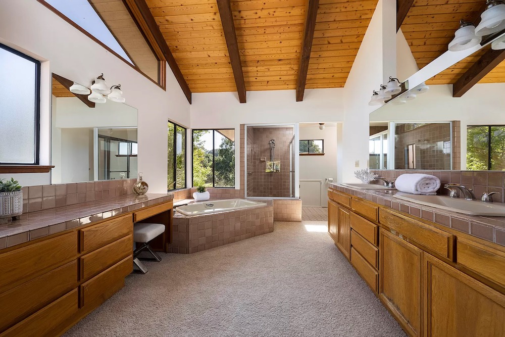 The best thing about the 1984 house at 4488 La Paloma Avenue ($5.3 million) on Pill Hill is the four-acre flag lot; also, there’s a three-bedroom guest house. It all requires attention, however. P.S. Two words come to mind whenever I see a carpeted bathroom: fingernail clippings.