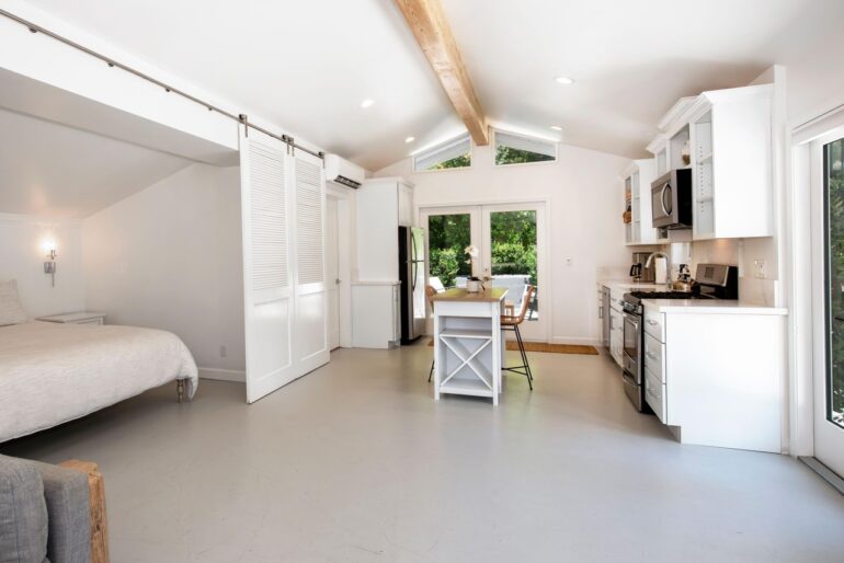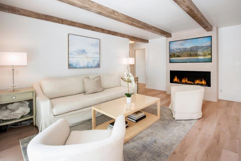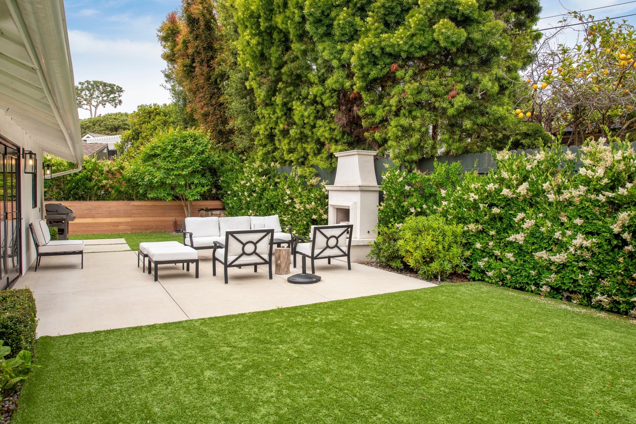 I don’t know how 232 Las Ondas ($4.125 million) can be considered “oversized”: the main house has three bedrooms (one of which holds a twin) and one bath (if I’m understanding correctly), with another bedroom and bath in the garage-turned-ADU. And a fair amount of the .17-acre lot is front yard. It reads as fresh and clean, but the design is inelegant, with that hallway fireplace, corner kitchen, and painted concrete floor in the ADU. Four million dollars! Five years ago, you could buy a house in Montecito for that.