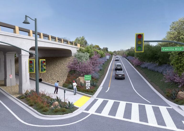 ••• The next segment of the widening of Highway 101—from Hermosillo to Salinas—will start in the spring and take at least three years. An email from the Montecito Association says that both Hot Springs/Cabrillo exits, northbound and southbound, will be closed from the spring of 2026 to summer of 2028 (“The Cabrillo Boulevard Interchange will be reconstructed with two new bridges and right-hand freeway ramps, including a new southbound on-ramp [above].”) A temporary traffic signal will replace the stop sign at the Hermosillo off-ramp.