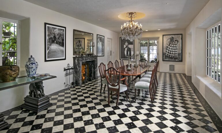 Off the inviting foyer, a wood-paneled study awaits, as does the gorgeous formal dining room—a special place for sizable dinner parties or intimate repasts, it has a traditional checkerboard marble floor and Nero Marquina black marble mantlepiece. Throughout the main residence there are beautiful marble and hardwood floors, custom chandeliers and sconces, and designer fixtures, expertly melding Old World charm with New World comforts.