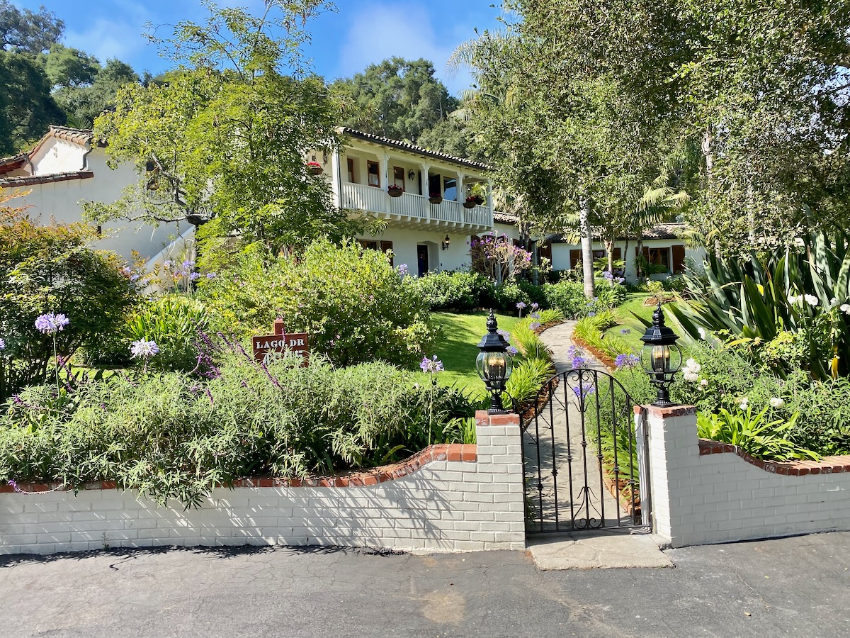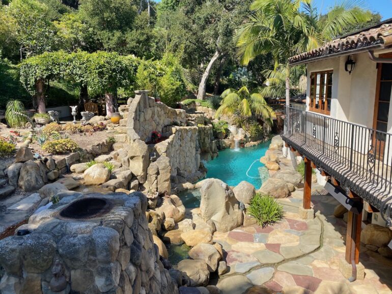 1927 Joseph Plunkett house in Hope Ranch with a marvelous “oasis-like pool, complete with a slide, fire fountains, a waterfall, a Jacuzzi, and an outdoor sauna.” The property is now for rent at $37,000 per month.