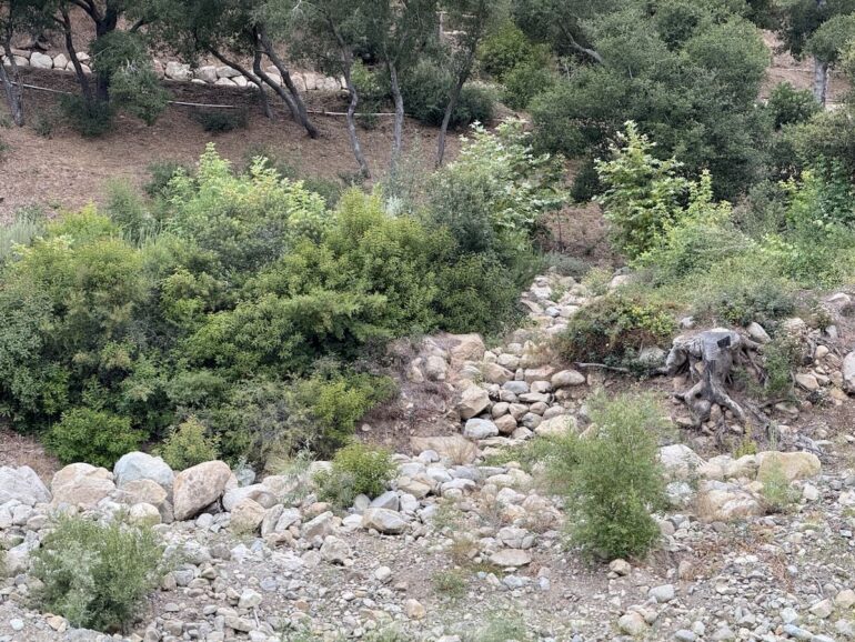 P.S. When I went to take the above photo, I noticed what look like stone steps on the San Ysidro Ranch side of the creek. “Those are actually drainage swales for runoff during rain events, with rock placed there to prevent erosion,” says Shank.