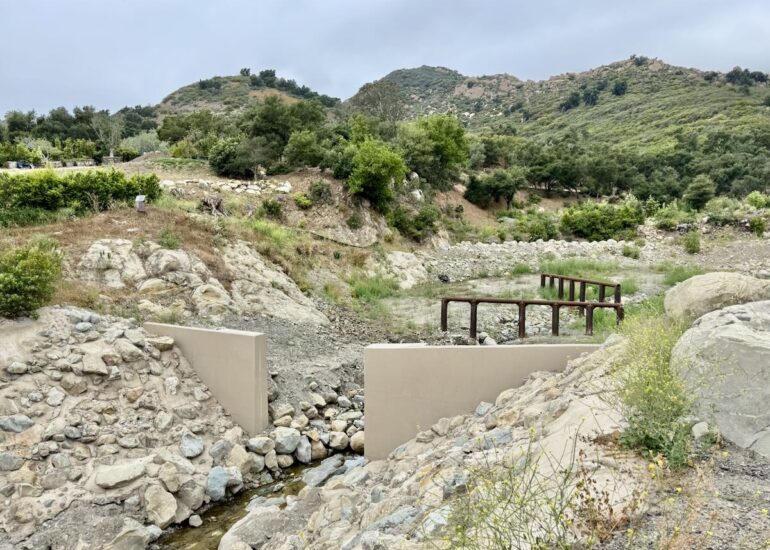 The new concrete structure is designed to hold water back, the better to lower the speeds of what’s coming downstream, with an opening the width of the natural channel to allow for the passage of fish (the southern steelhead trout, in particular). As for the two metal debris racks, they might trap some rocky material, but they’re really meant to catch floating woody debris that could cause blockages downstream. They’re angled that way to avoid complete blockage, and so that if the top rack gets filled, the second one can catch more.