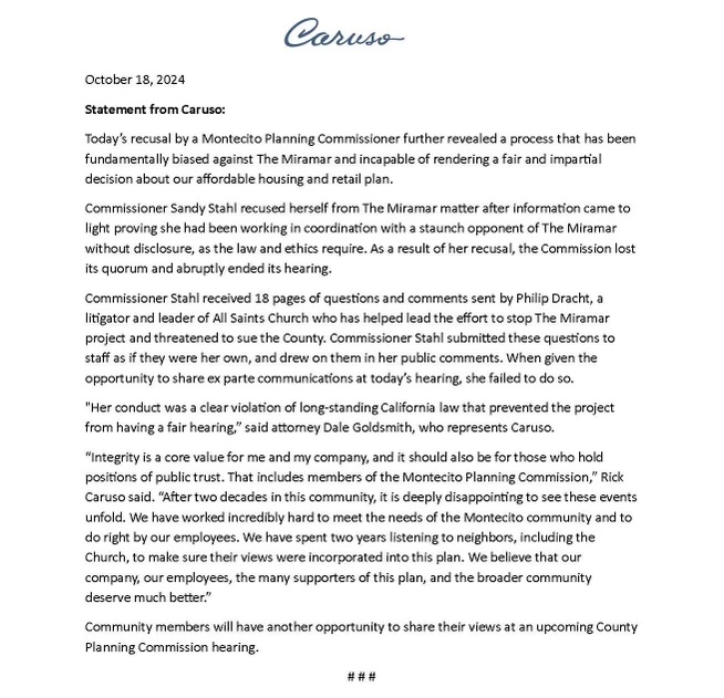 ••• The Montecito Planning Commission fought for an opportunity to weigh in on developer Rick Caruso’s plan to add 17,500 square feet of retail and 34 apartments at the Rosewood Miramar Beach—and then blew it. From Noozhawk: