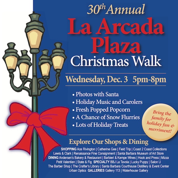 Kick off the holiday season tomorrow evening with the 30th-annual Christmas Walk at La Arcada Plaza! It’s totally free and a tradition long enjoyed by hundreds of Santa Barbara families. We’ll have photos with Santa, holiday music and carolers, lots of holiday treats, and even a chance of snow flurries. With twinkling lights, festive decorations, and charm you won’t find anywhere else, it’s the perfect spot to shop, dine, and create holiday memories. Come experience the merriment of the holidays at La Arcada Plaza—your holiday destination awaits!