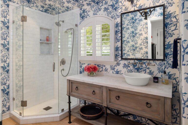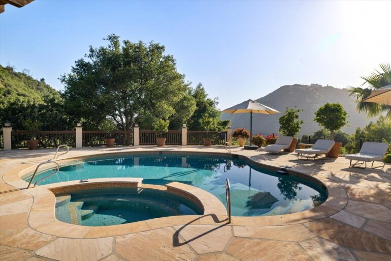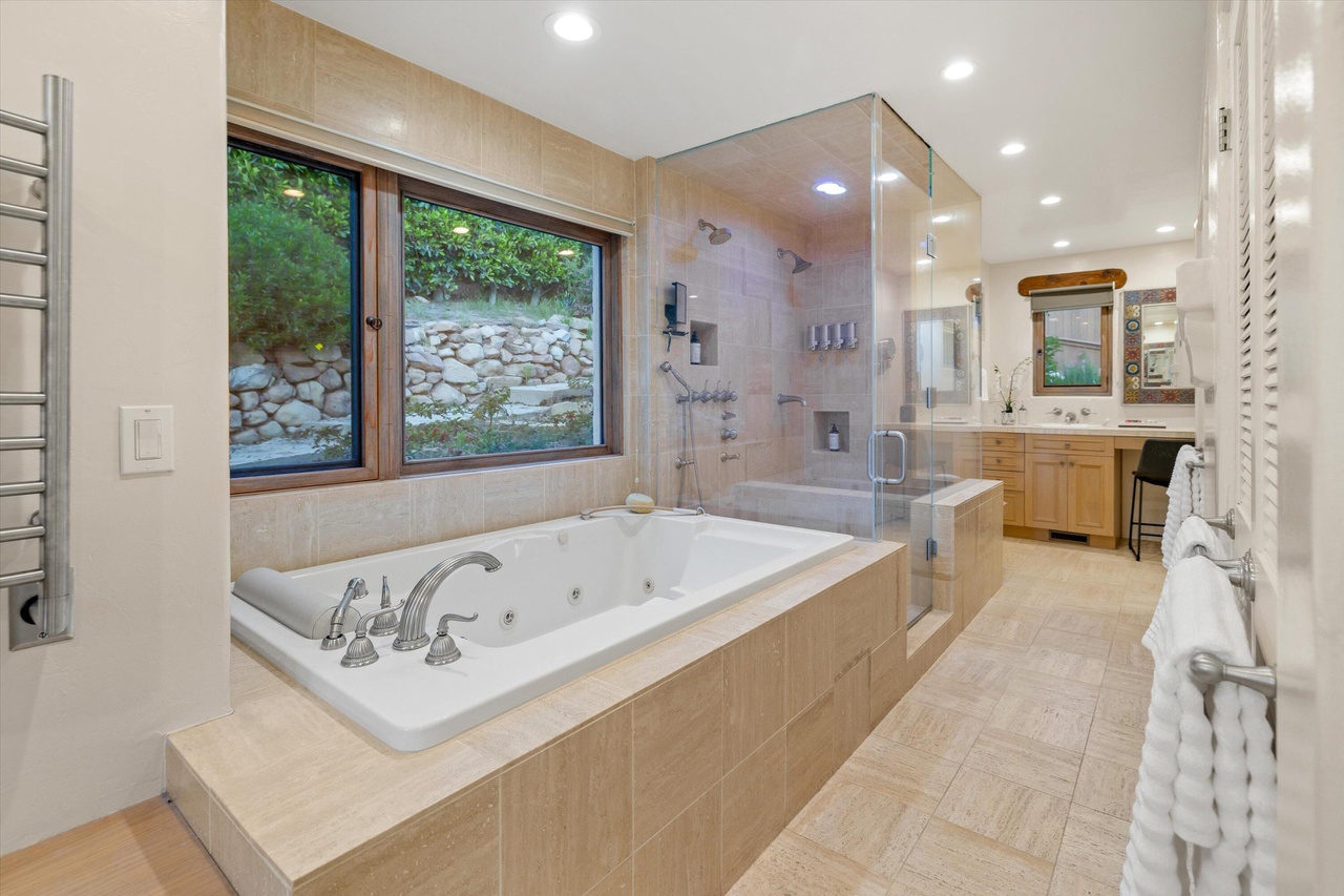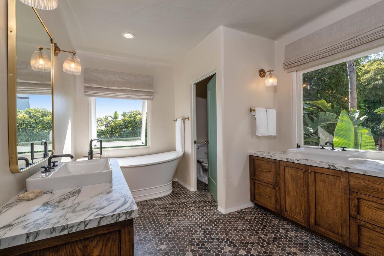At the end of the long, winding Hidden Valley Lane, 3091 Hidden Valley Lane ($10.495 million) is a prime example of the Supertuscan style so popular in Montecito at the start of the century. Stripping away some of the flourishes will help calm it down, and it does have size (four bedrooms, five baths, two half baths) on its side, with views. P.S. Note the fireplace by the bathtub.