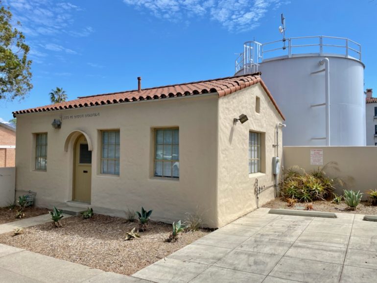 The architecture in the Presidio’s eastern corner skews industrial/utilitarian. The little building in the first photo used to have “Survey Office” over the door, but that signage has come down. Google says Ortega Groundwater Treatment is at the address (220 E. Ortega), which must explain the tanks.