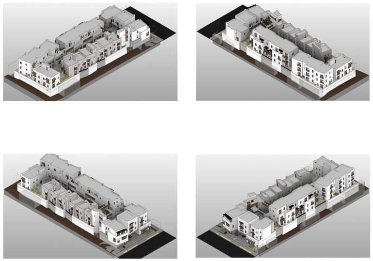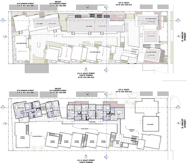 ••• 219 E. Haley Street is back in front of the city’s Architectural Board of Review on March 7: “This project received Project Design Approval from ABR in January 2020. The project has been revised to a larger building of 28,070 square feet (vs. 26,835 square feet) with an average unit size of 762 square feet (vs. 725 square feet) and the building is proposed to be 48 feet tall vs. 45 feet tall. Project also added private rooftop decks and access to townhouse units, fenestrations and floor plans.” What I find interesting about the project—“a four-story, 34-unit, mixed-use development […] with two commercial spaces”—is the way some of the buildings are set at an angle.