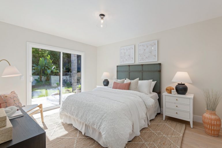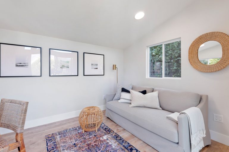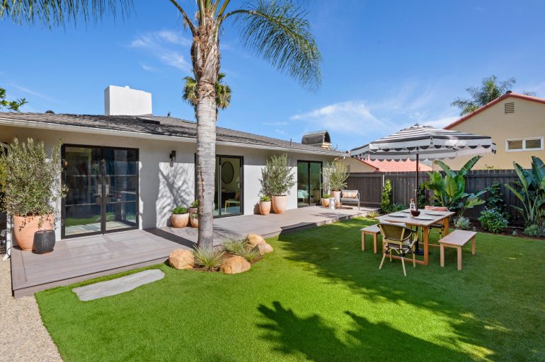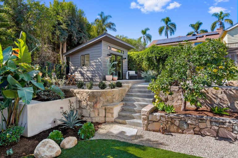 This light-filled, airy, 3/2+ home boasts a gourmet chef’s kitchen with a Wolf range, luxury ensuite primary bath, three downstairs bonus rooms, original French oak floors, fireplace, and high-end finishes throughout. The kitchen and bedrooms open onto a spacious Trex deck and gorgeous garden designed by the award-winning firm Isa Bird Landscape Design. Bubbling fountains, an outdoor firepit area, mature citrus trees, bountiful avocado and macadamia nut trees, passion fruit vines, low-water, lush plantings, and two luxe artificial turf lawns complete the stunning indoor-outdoor experience.