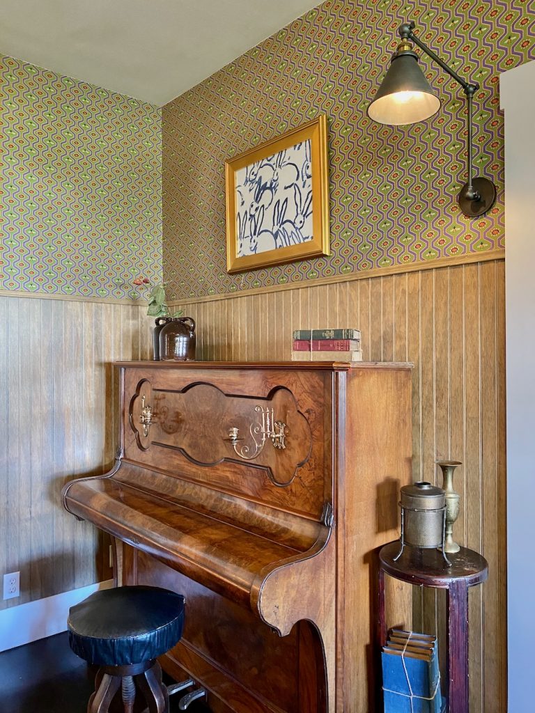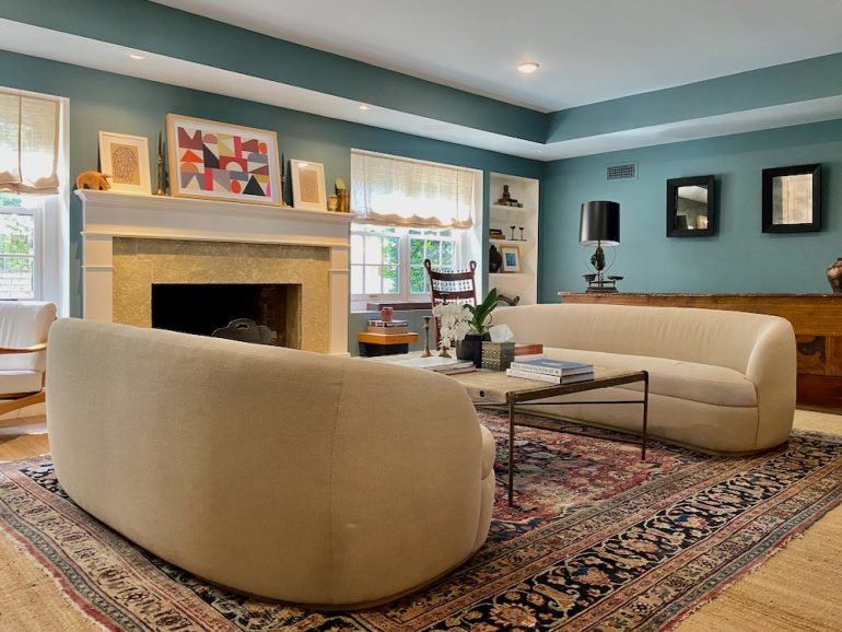 Interior designer Whitney Able Melnick has introduced a playful, contemporary vibe, with high-contrast black-and-white in the double-height lobby and a mix of colors, patterns, and materials in the three sitting rooms. In the last photo below, that’s Gucci wallpaper under the Hunt Slonem bunny print.