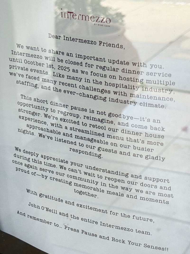 ••• Intermezzo posted an announcement explaining why it has been closed for most of September and how it plans to reopen October 1. That appears to be getting pushed back, as reservations on OpenTable are available starting October 7.