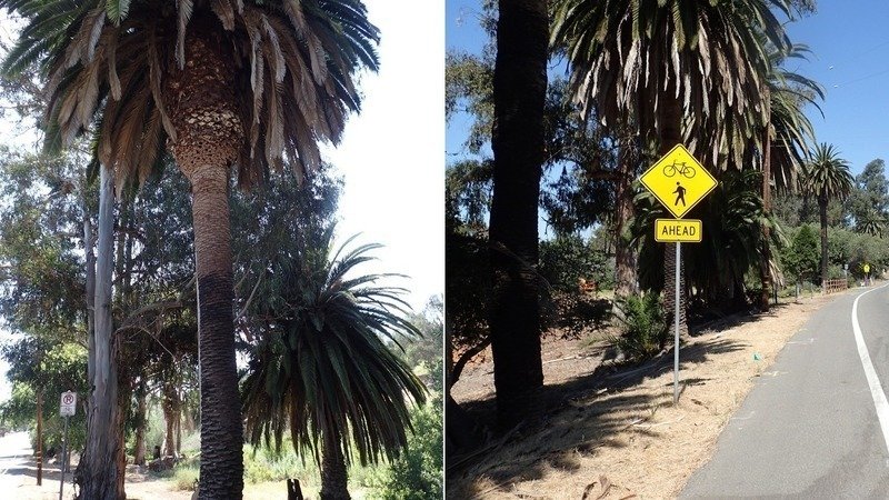 The current plan to spend $5.35 million to construct the Modoc Road multi-use bike path, a new 3939′ (.74 mile) off-road path which is in addition to the current existing bike path along Modoc Road in Santa Barbara, will result in the REMOVAL of a number of beautiful, mature, and distinctive Canary Island palm and Eucalyptus trees…as well as a number of native California Coast live oak. 63 trees in total.