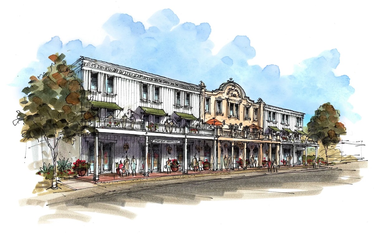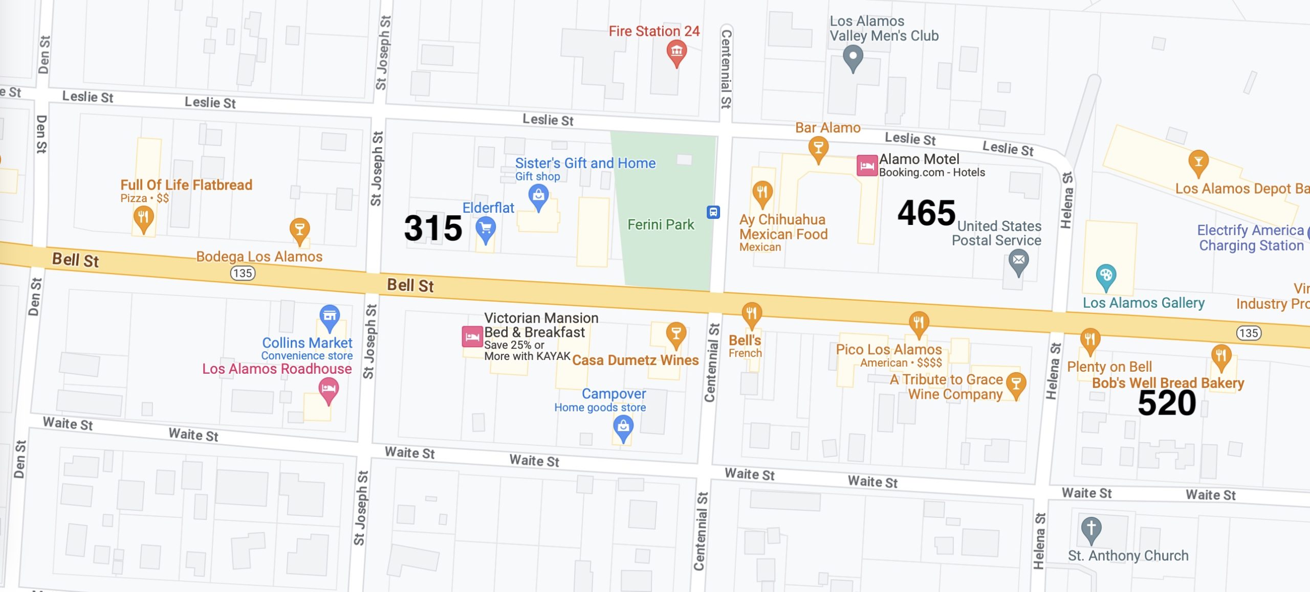 A block away, at the vacant lot (465 Bell Street) between the Alamo Motel and the post office, a “three-story hotel, restaurant and gourmet hall” is in the works. “The first floor will house the gourmet hall of 15,923 square feet, the second and third floors will have 28 units.” It’s called The Cottonwood (“los alamos” translates to “the cottonwoods” in English), and as the link implies, there’s already a website. The only image specific to the project is the drawing below. The architecture looks acceptable, but in this kind of endeavor, execution is everything.