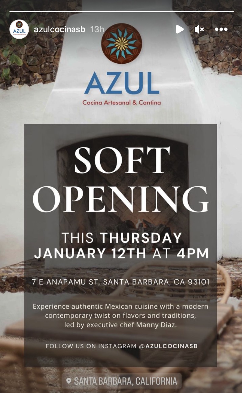 ••• Azul, the Mexican restaurant in the former Somerset/Smithy/La Cocina space on Anapamu (State/Anacapa) is soft-opening tomorrow at 4 p.m.