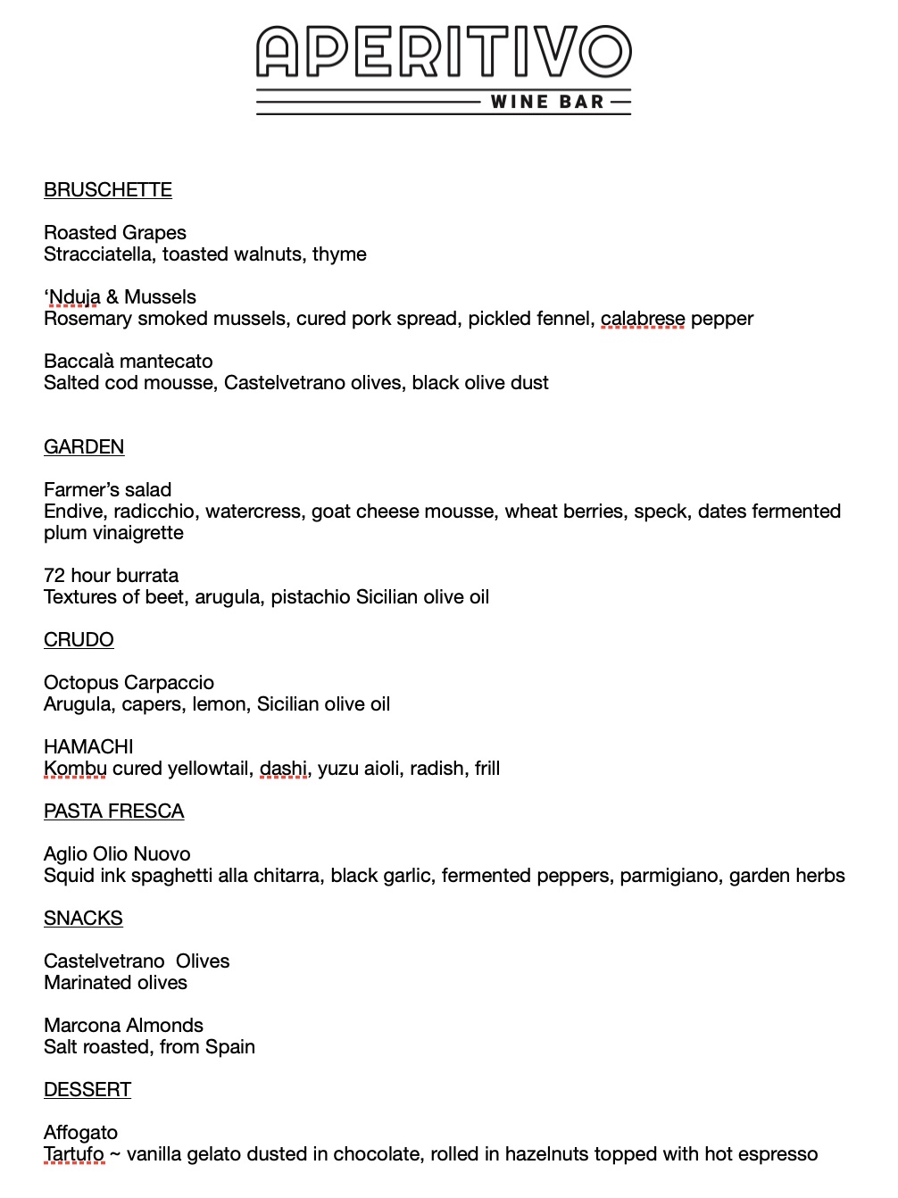 Aperitivo, the Italian wine bar from chef Brian Dodero (of the S.B. Test Kitchen pop-ups) and sommelier Andrea Girardello, throws open its doors this Tuesday night, 4-9 p.m., in the W. Haley space most recently home to Mosto. The interior and menu tell a refreshingly sophisticated story, with options such as roasted grapes with stracciatella, toasted walnuts, and thyme; salted cod mousse with Castelvetrano olives and black olive dust; and squid-ink spaghetti alla chitarra with black garlic, fermented peppers, parmigiano, and herbs. “Our menu will evolve every week, based on seasonality and what’s available at the farmers’ market,” say the co-owners. And rare for these parts, the wine list is almost entirely Italian.
