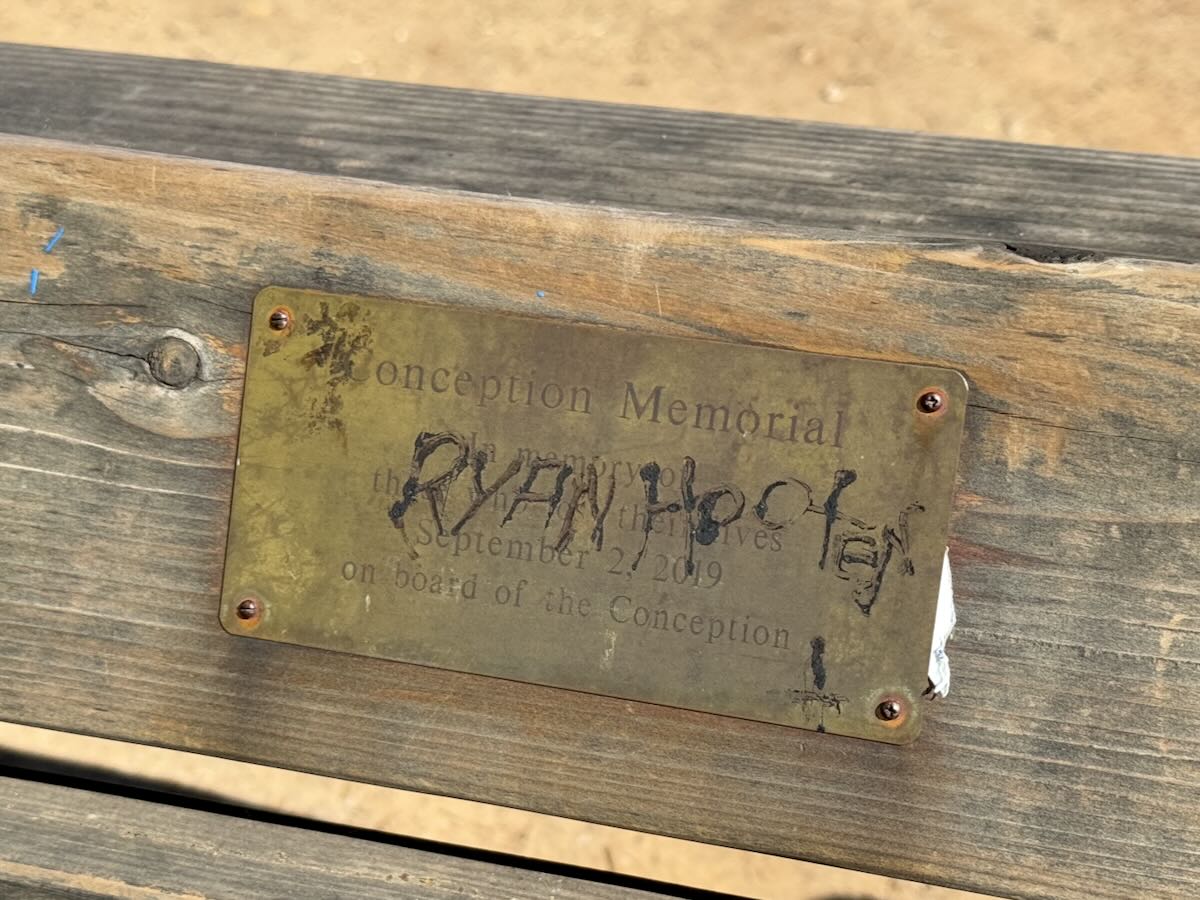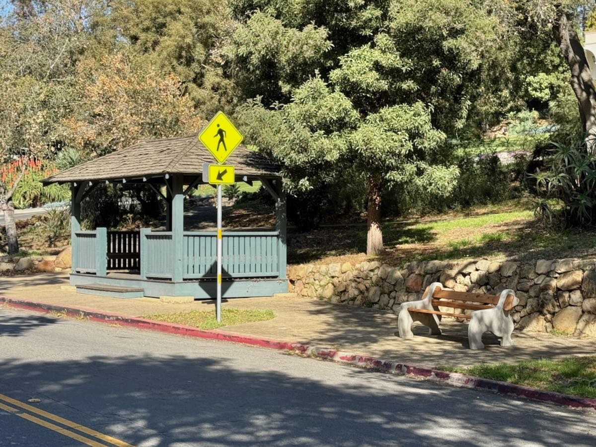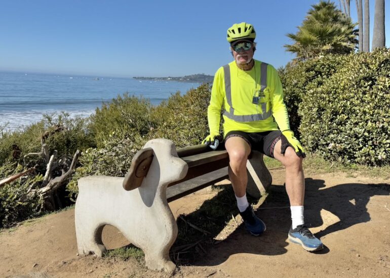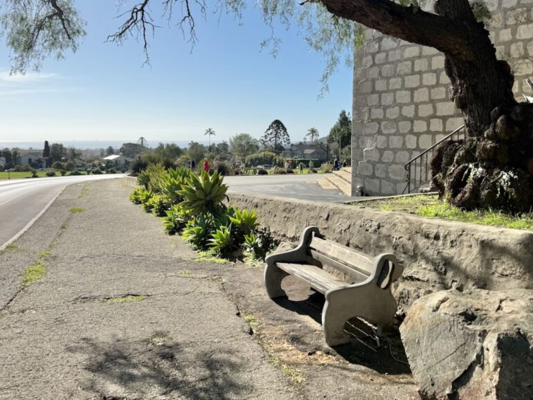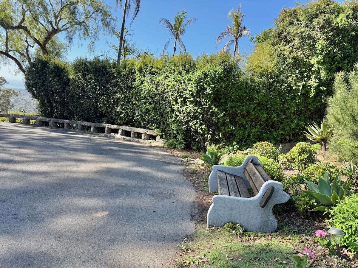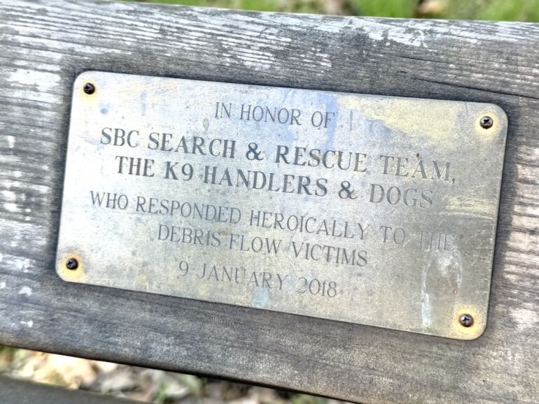 The first bench, made entirely made of wood, didn’t hold up well. He switched to concrete, hiring Kenney Construction to cast the sides. The question, then, was where to put it. One of his neighbors on the Riviera is Kim Cantin, who lost her husband and son in the 2018 debris flow; she suggested Casa Dorinda, as a tribute to the dogs and handlers of Santa Barbara County Search and Rescue.