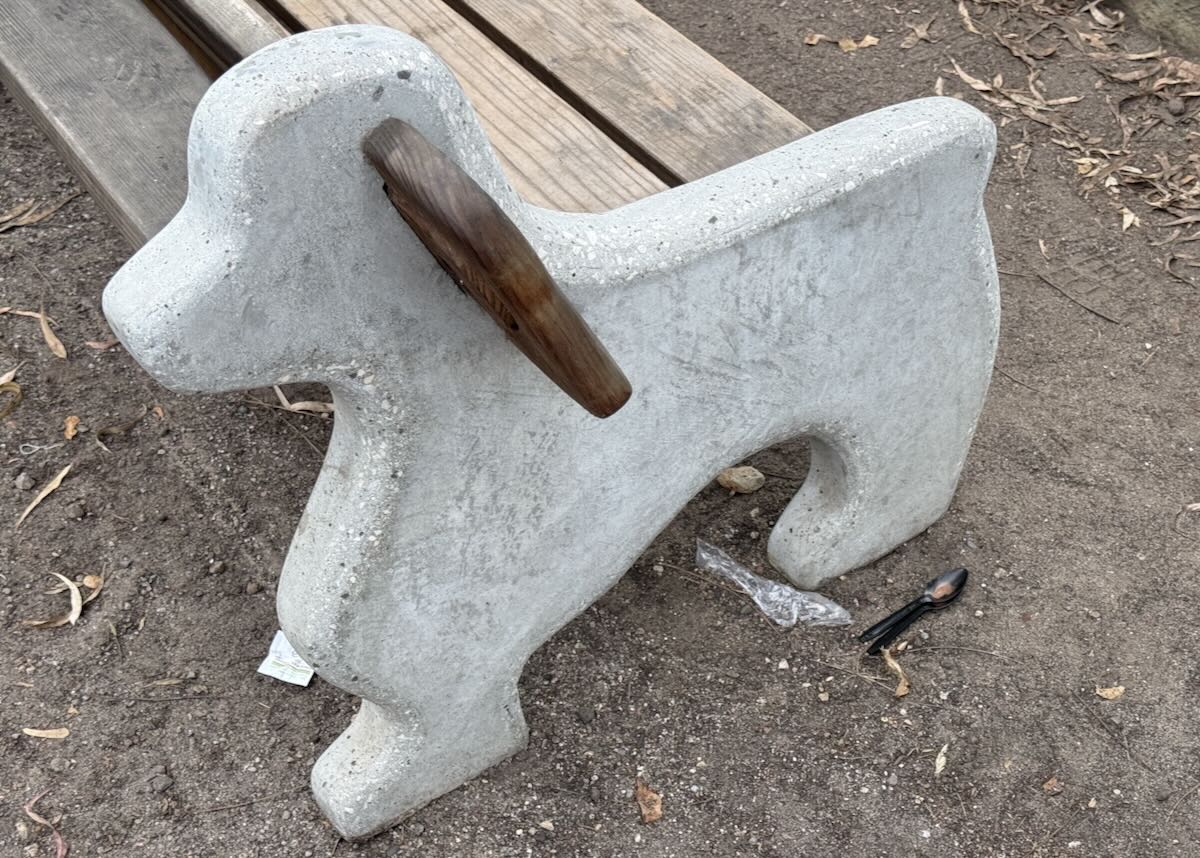 And more are on the way: the city’s Parks & Recreation department has commissioned him to make five, with four destined for the Douglas Family Preserve. There are strict rules about what can be installed where, and by whom, but the staff found a workaround to allow for the dog benches at parks (as long as they don’t have plaques).