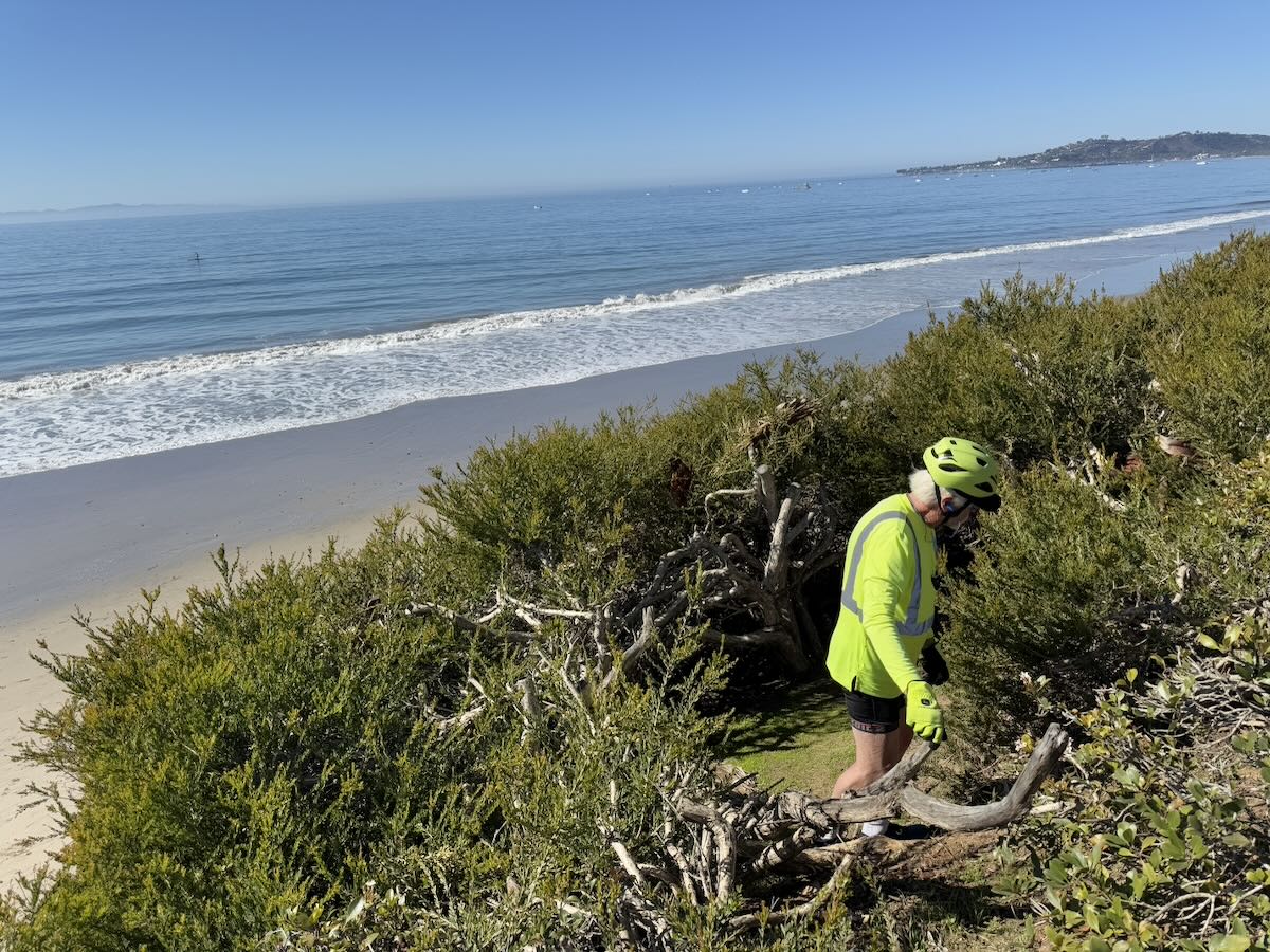 Darlington is 75 and lively as hell—just ask him about his adventures kayaking out to the oil rigs. Every Sunday morning, he rides his bike around town to check up on the benches. I recently joined him at Casa Dorinda and Butterfly Beach, where he cleaned up the litter around the benches and made a note of anything that needed to be fixed. Generally, people treat the benches with respect. “The Casa Dorinda one is the only one to have a problem,” he says. “Someone tore an ear off, so I made a new one and clamped it on. They came back and stole the new ear and the clamp.”