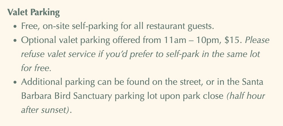 ••• S.B.F. pointed out that Ospi has clarified the parking situation on its website—the relevant part being that you can self-park in the valet spots. Unsaid but pertinent: don’t park in front of 30 Los Patos Way.