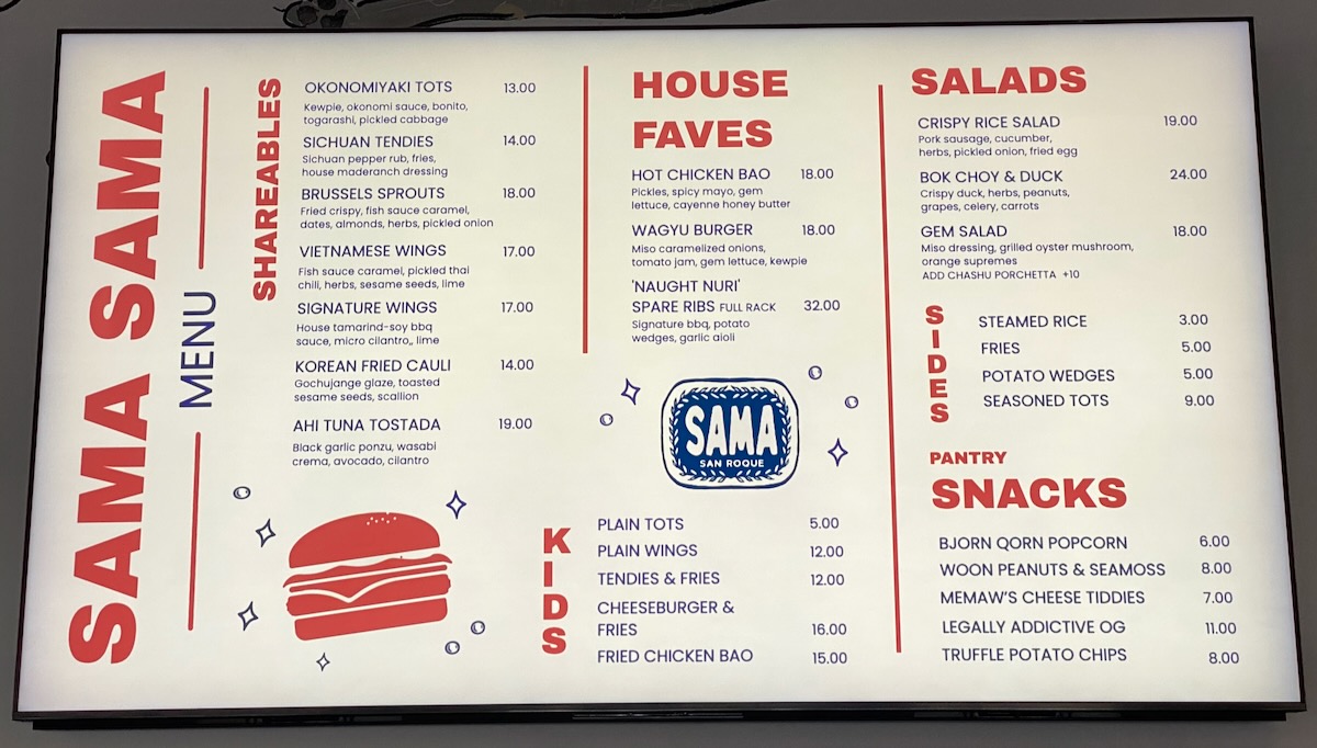 In an exciting development for the area, the food is by Sama Sama. For Sama San Roque, Ryan Simorangkir and Tyler Peek have devised a menu (below) more akin to the one at the Topa Topa taproom in Ojai than at the State Street flagship. You order at the kitchen window or via QR code, and then you pick up from the window when it’s ready. For dessert, there’s a freezer stocked with treats from Rori’s.
