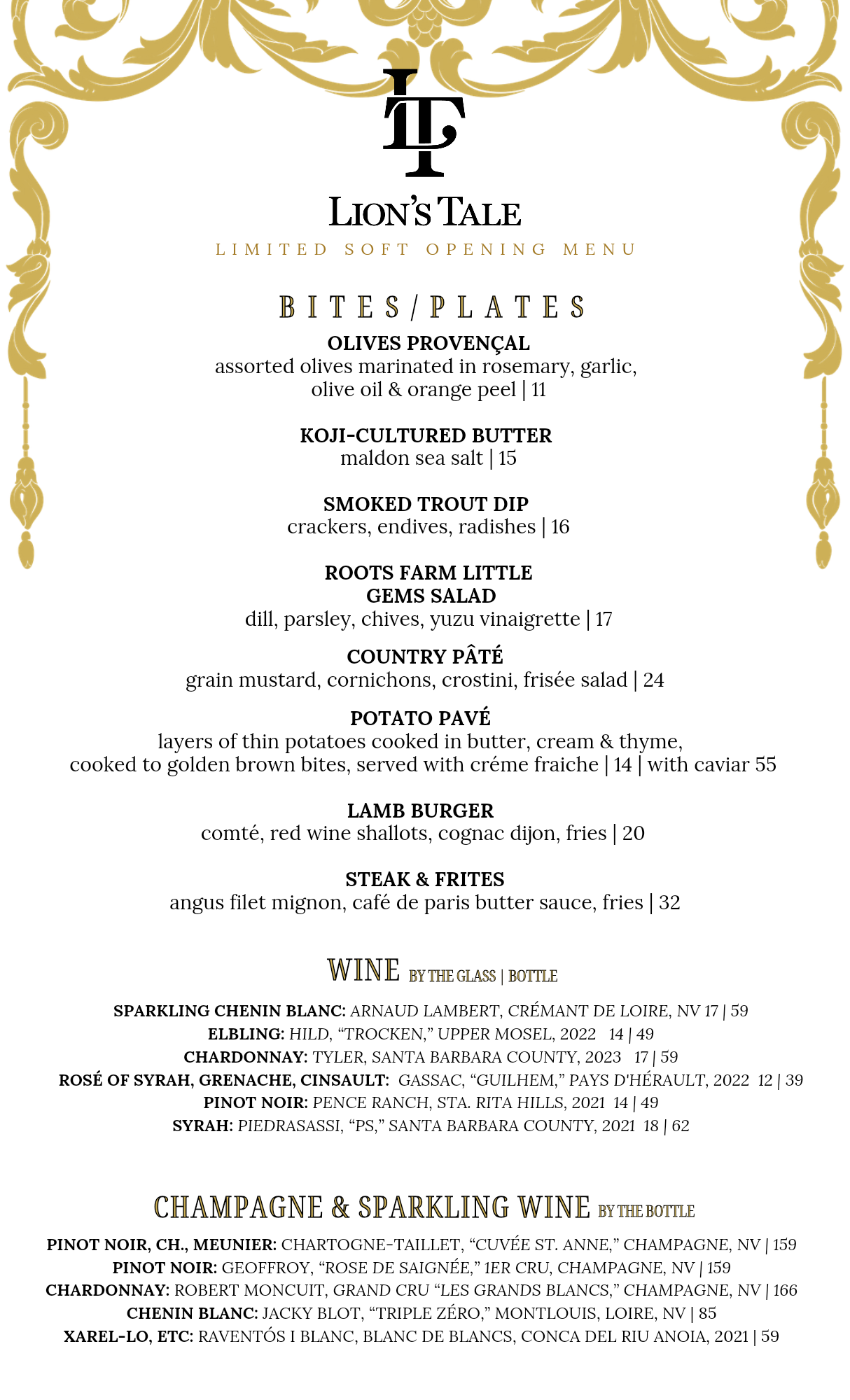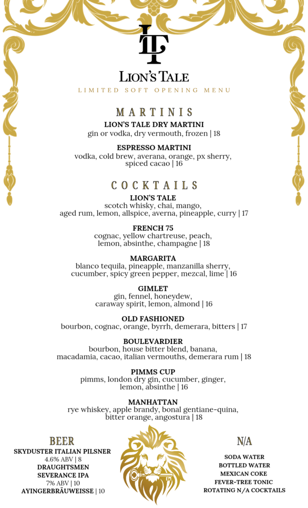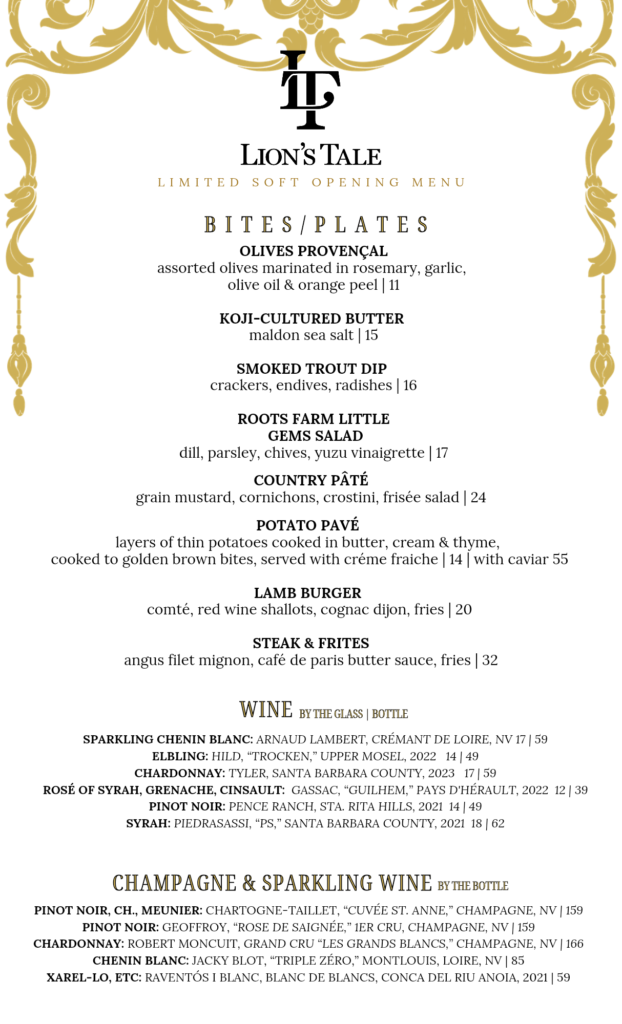 For the time being, the hours are 3 p.m. to midnight, with a weekday happy hour from 3 p.m. to 5:30 p.m. Reservations are not accepted, although they’re likely to make an exception for parties of six or more. And if you didn’t already have enough reasons to want to go: Lion’s Tale offers free valet parking.