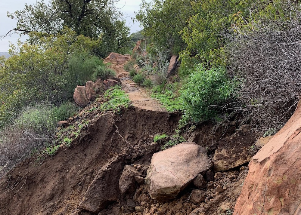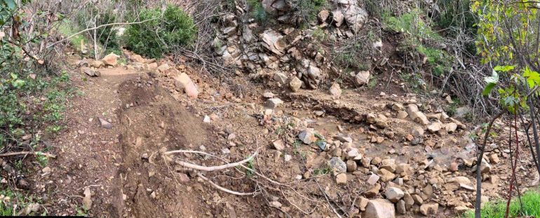 ••• From the Los Padres Forest Association: “The Forest Service has issued a forest-wide closure of the Los Padres Forest” effective immediately, and that includes the front-country trails. “The closure order states that the closure will last 60-days but we’re hopeful that it can be revised or modified on a local level as portions of the forest are surveyed, cleaned up, and repaired.” (And the Forest Service announcement itself threatens that “law enforcement officers will strictly enforce the closure order, which carries a penalty of $5,000 and/or six months in jail.”) To help speed things up, consider donating to the LPFA or the Montecito Trails Foundation. (The above photo of McMenemy Trail is by MTF scout Scott Addison Jerlow; the one below is of Montecito Hot Springs, via the LPFA.) And speaking of the MTF, it had this to add: