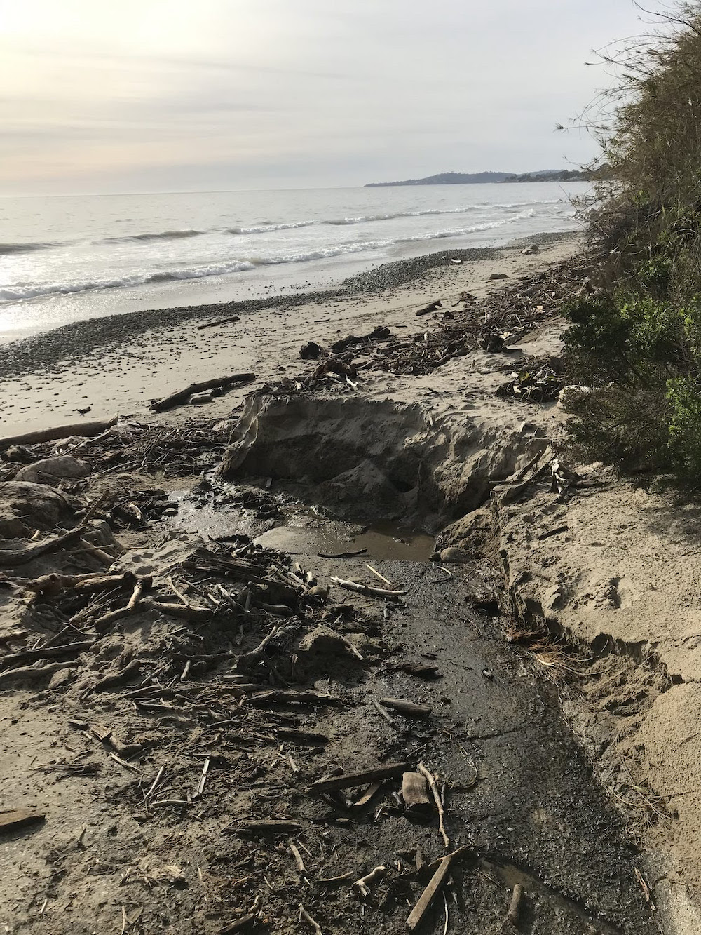 ••• The Summerland Citizens Association sent out an update on the offshore oil seepage, including all the oily stuff washing up on the shore; also, beach erosion has exposed all manner of old oil-industry infrastructure that’s best avoided. Officials said sand will return to cover it up. (Photos by Robin Van Tassell and Phyllis Noble, respectively.)