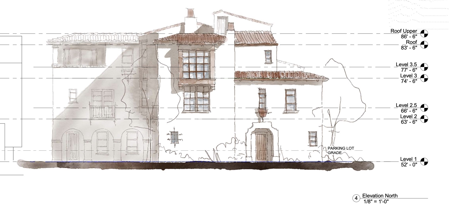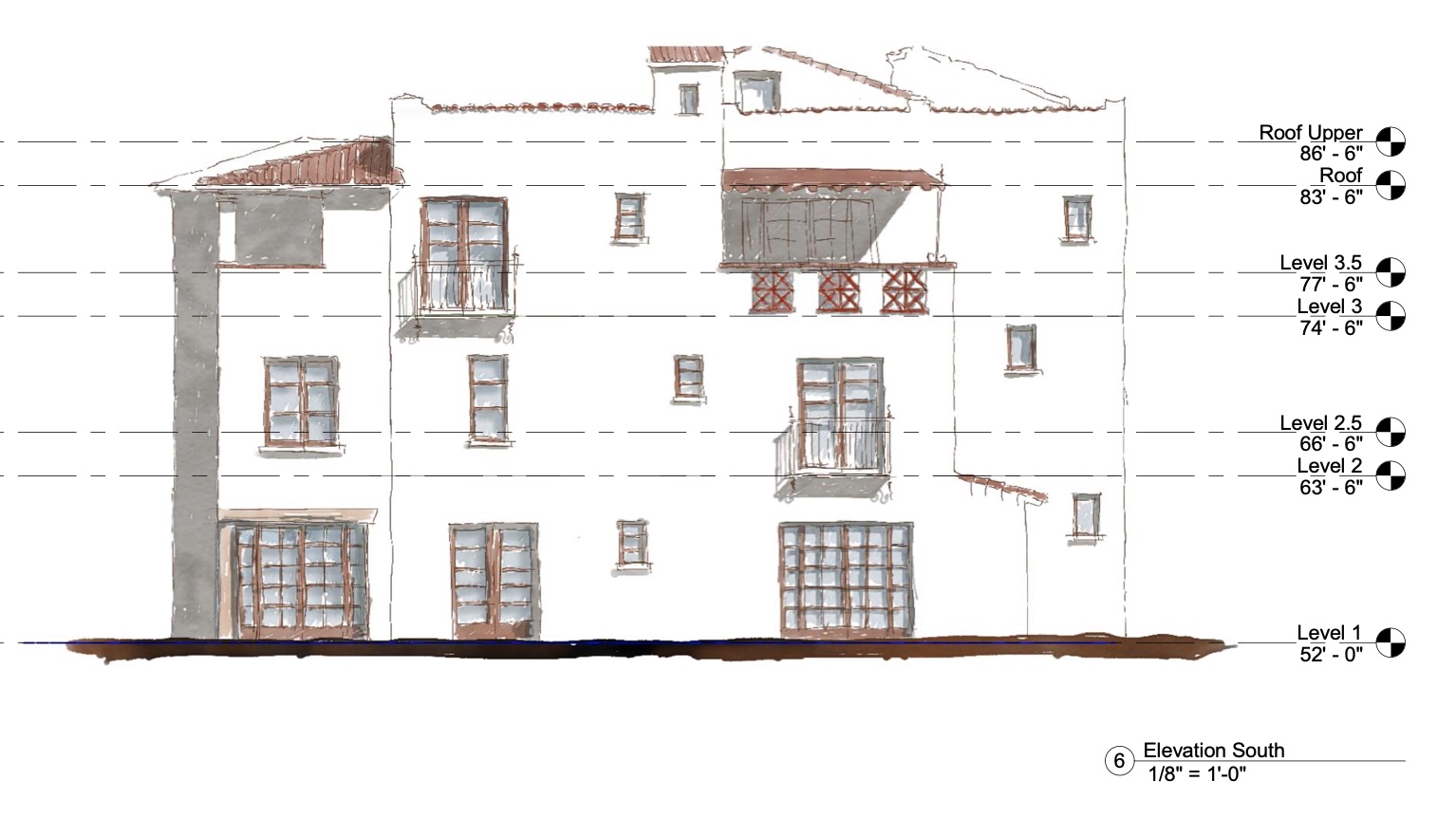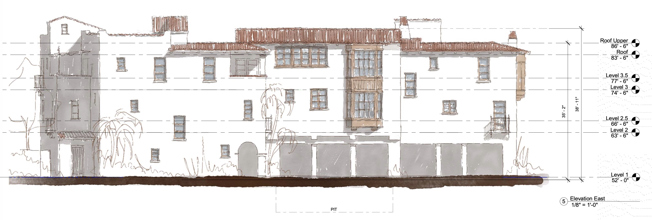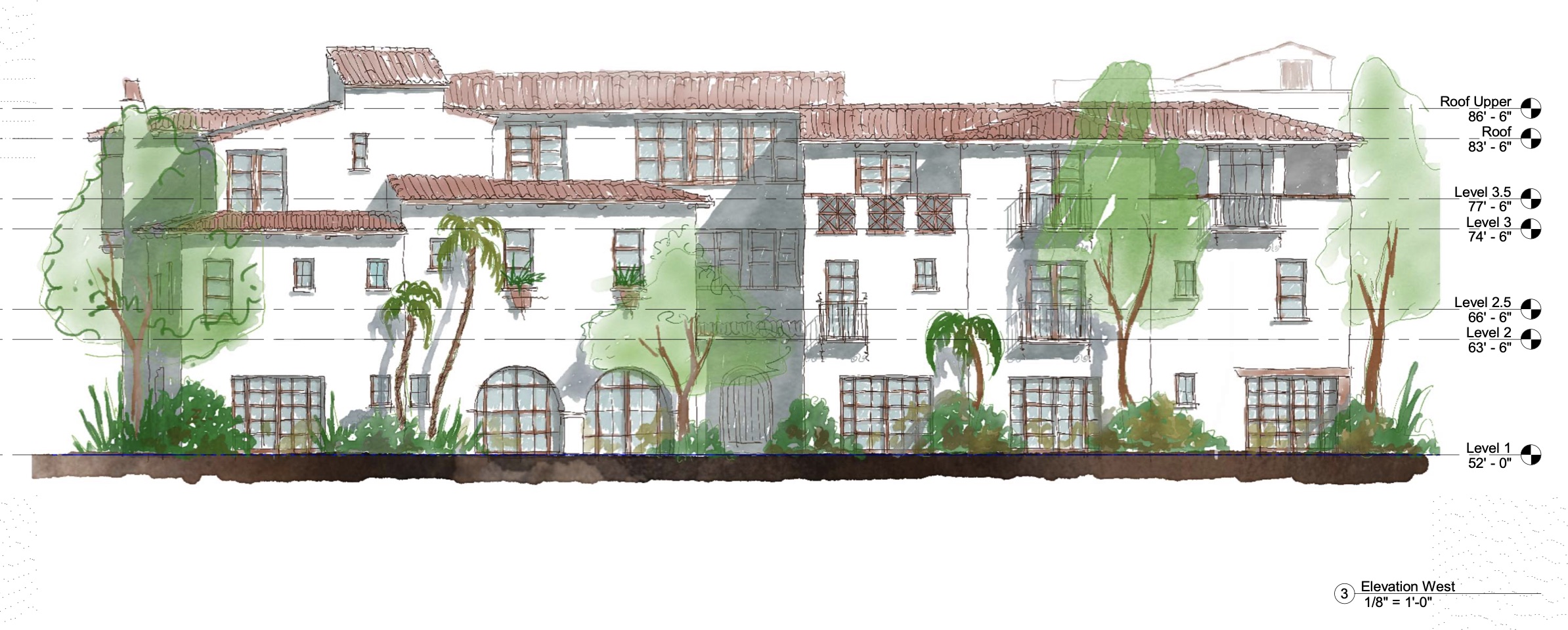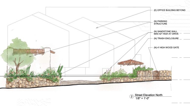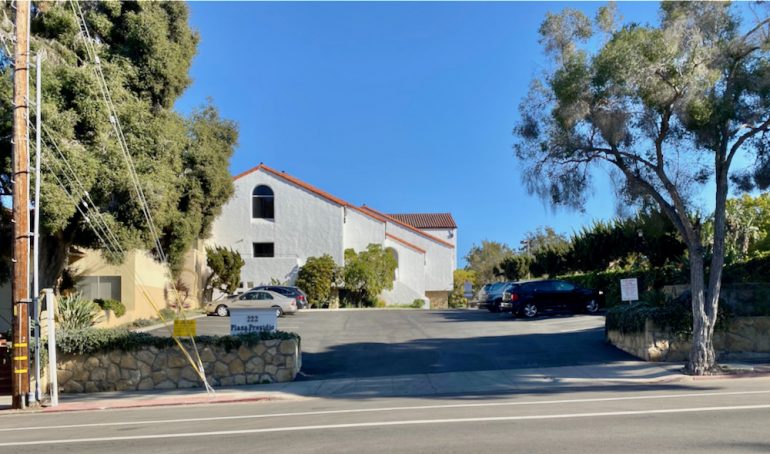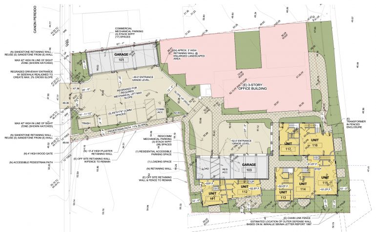 ••• Interesting item #1 on the agenda of Wednesday’s meeting of the city’s Historic Landmarks Commission: renderings for the project at 222 E. Canon Perdido Street, in the works for a while. “Proposal to convert the existing commercial office building to a commercial condominium, and construct a new two- and three-story residential project comprised of seven condominium units. The residential unit mix consists of six two-bedroom units and one three-bedroom unit. The project includes two puzzle lift systems, one system containing 17 spaces dedicated to commercial parking, an additional system containing eight spaces for both residential and commercial parking, and a total of eight surface parking spaces.” In the second image below, Canon Perdido is to the left. The full plans are here.