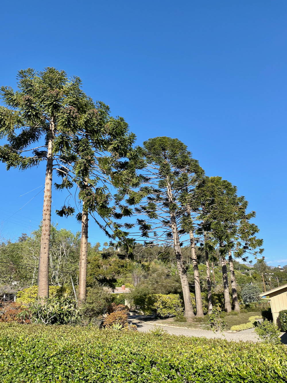 ••• The tree of the month is the marvelous Bunya-Bunya: “If you want to feel what it must have been like to live in the age of the dinosaurs, just stand underneath a Bunya-Bunya and look up. It fits naturally into a prehistoric Jurassic Park setting, precisely because it is the last remaining species of the Bunya Section of the genus Araucaria. This was the predominant conifer genus on the single supercontinent, Pangaea, during the Jurassic era—199.6 to 145.5 million years ago.” But be careful in August and September, when the 20-pound seed cones might fall and beanya-beanya. —Edhat
