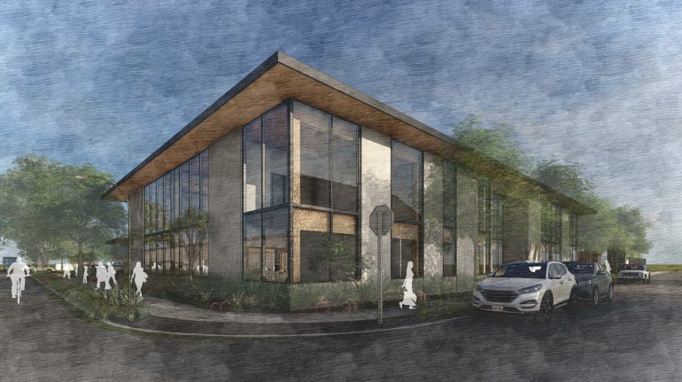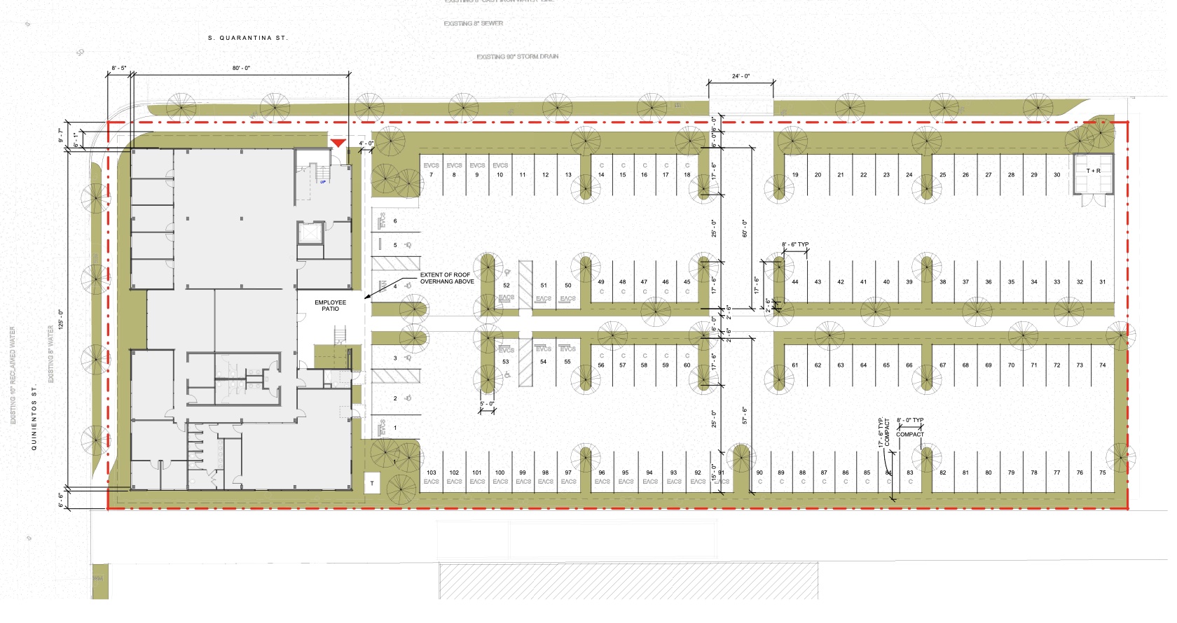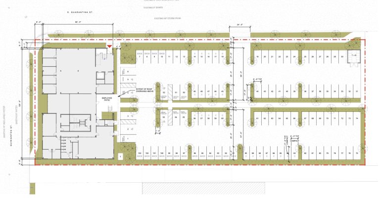 ••• Tomorrow’s Architectural Board of Review agenda includes the largest new building we’ve seen in these parts in a long time: a two-story, 18,774-square-foot office building for Marborg Industries, with 104 parking spaces. (Now we know what the company is doing with that price increase!) It’s at 2 S. Quarantina Street (at Quinientos). While the design by Cearnal Collective is handsome, I wish there was a way to shrink the ocean of parking—a two-story garage with an adjacent park, perhaps.