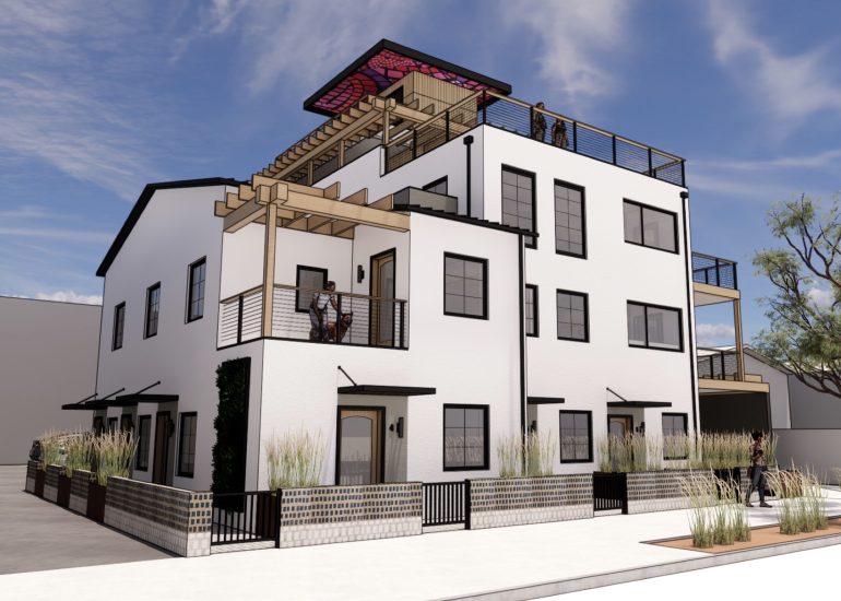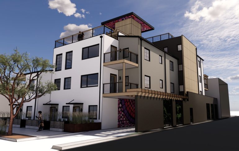 ••• Also on the ABR agenda: 428 Anacapa Street (Gutierrez/Haley), where “the proposed project involves demolition of two single family residences and a detached garage, and construction of a new mixed-use structure comprising six short-term rental units on the ground floor and nine long-term rental apartments on the second through fourth floors.” I wonder what the thinking is behind the red canopy. UPDATE 8/7: From the developer: “Just wanted to shed some light on the red canopy which is actually going to be an artistic design that will be glass and backlit. It also will match a similar mural at the entry to the parking garage.”