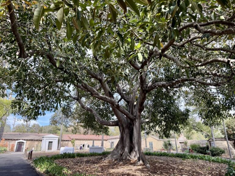 The centerpiece of the cemetery is a massive Moreton Bay fig tree, planted in 1890.