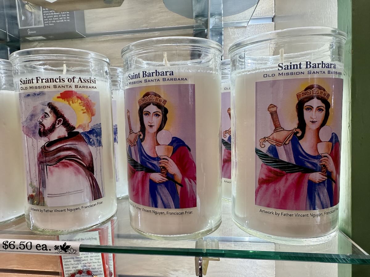 Naturally, you exit through the gift shop. I was tickled by the Franciscan wine bottle covers (so you can hide the bottle while in public?); the candles with Saint Barbara, who resembles Lynda Carter as Wonder Woman; and the St. Joseph Home Selling Kit. Whatever works!