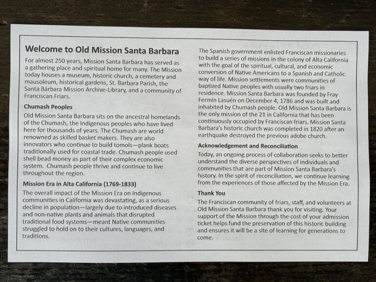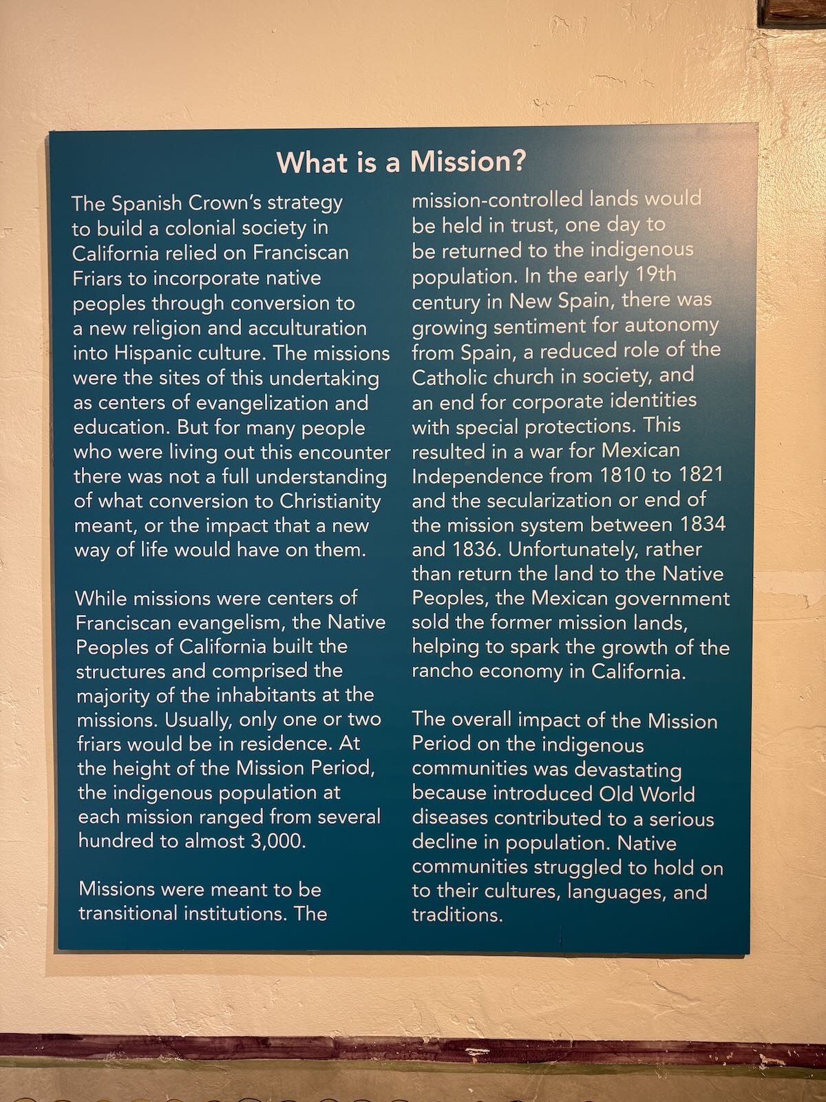 Tickets are $17 (less for seniors, kids, etc.), and guided tours are available on certain days. We opted for the self-guided option; there are QR codes throughout the grounds that play audio, but we were satisfied with reading the displays. The text on the back of the map gets right to the heart of the matter, noting that “the overall impact of the Mission Era on Indigenous communities in California was devastating.”