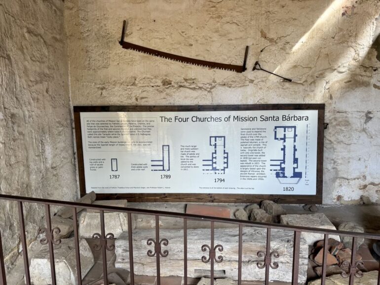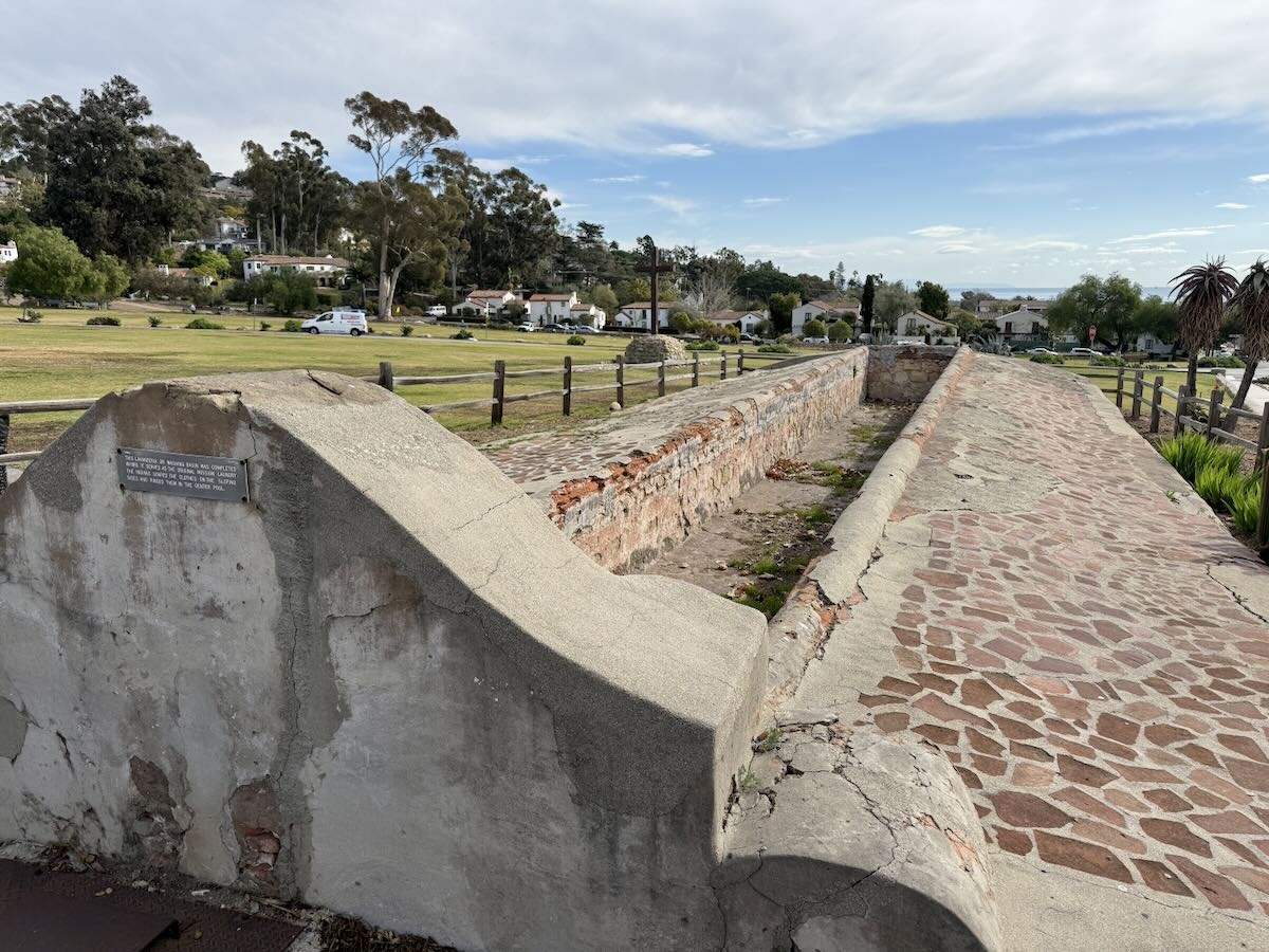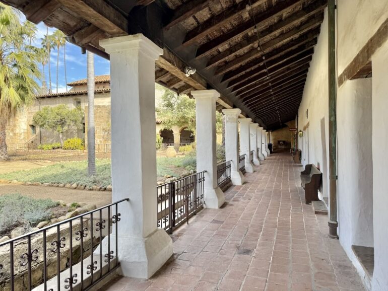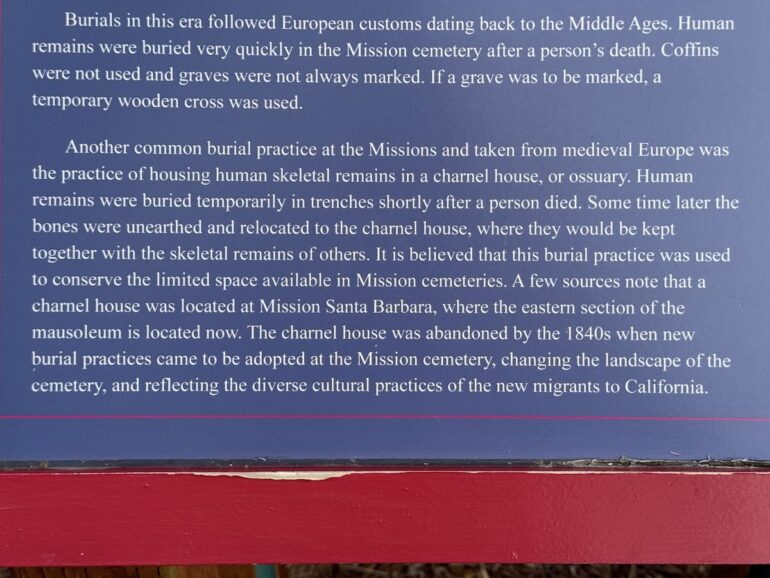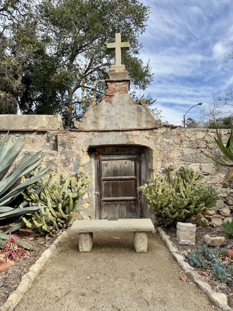 The route starts in a handsome courtyard called the Sacred Garden. “The fountain in the center is a Mission Era cistern” and “the drainage channel on the other side of the railing [is] a Mission Era feature designed to draw water away from the adobe Convento building and channel it down to the site of the former fields and the Mission’s Chumash village.”