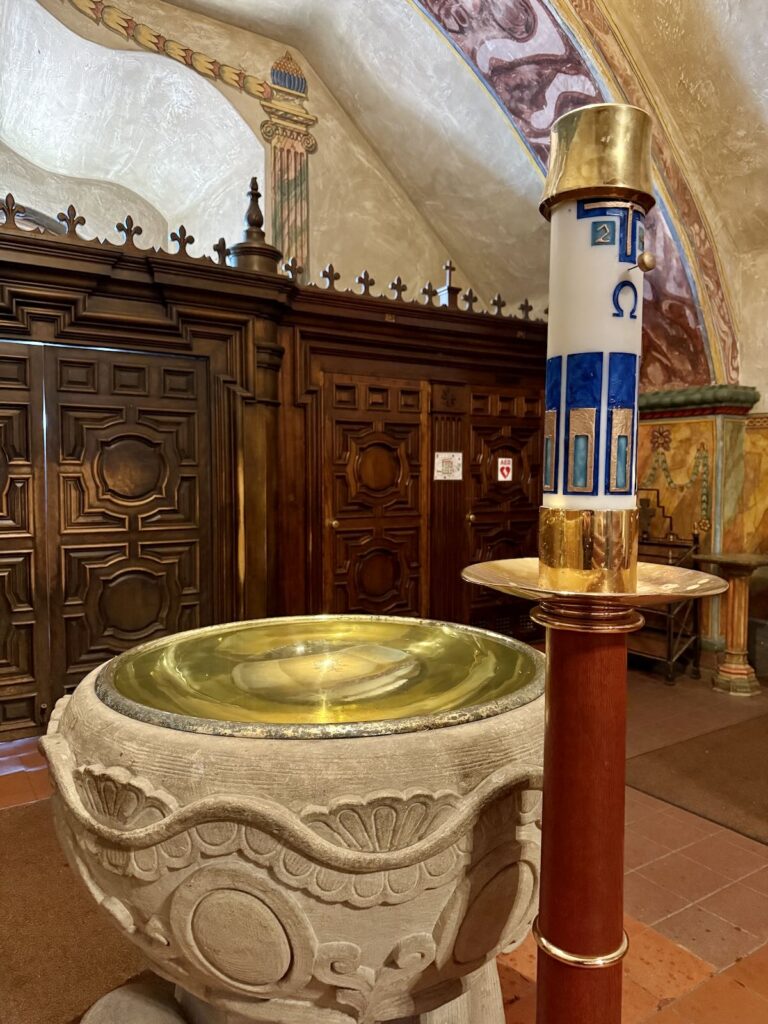 Signs point out that the church is very much in use today and ask visitors to be respectful. The font looks empty, but it’s filled with water as some people might have discovered by touching it.