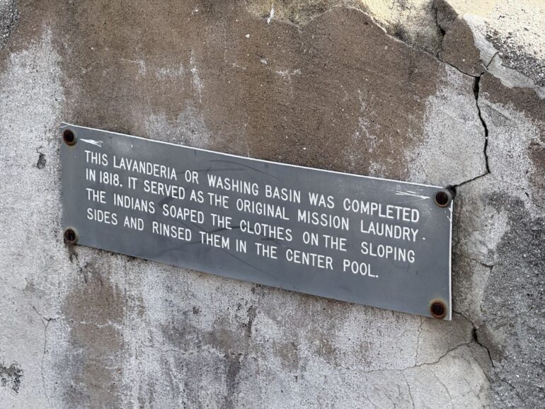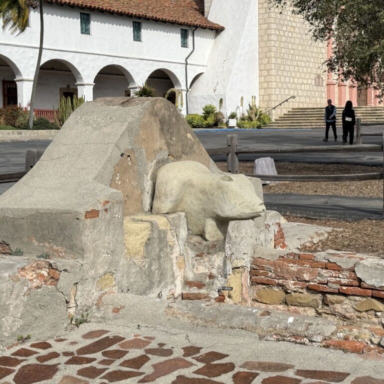 I had been on the grounds once before, years ago, but only to the gift shop when a friend wanted to buy a postcard. We must have walked right by the lavanderia, a basin for washing clothes. I surely would’ve remembered the charming stone animals at each end, believed to have been carved by Chumash mason Paciano Guilajahichet.