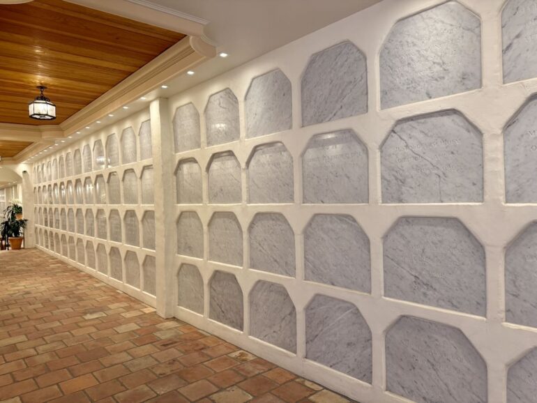 The mausoleum is also still in use. A niche for two urns runs from $8,500 to $44,000, depending on the location. Am I the only one who thinks it’s funny that a slot near the window costs more?