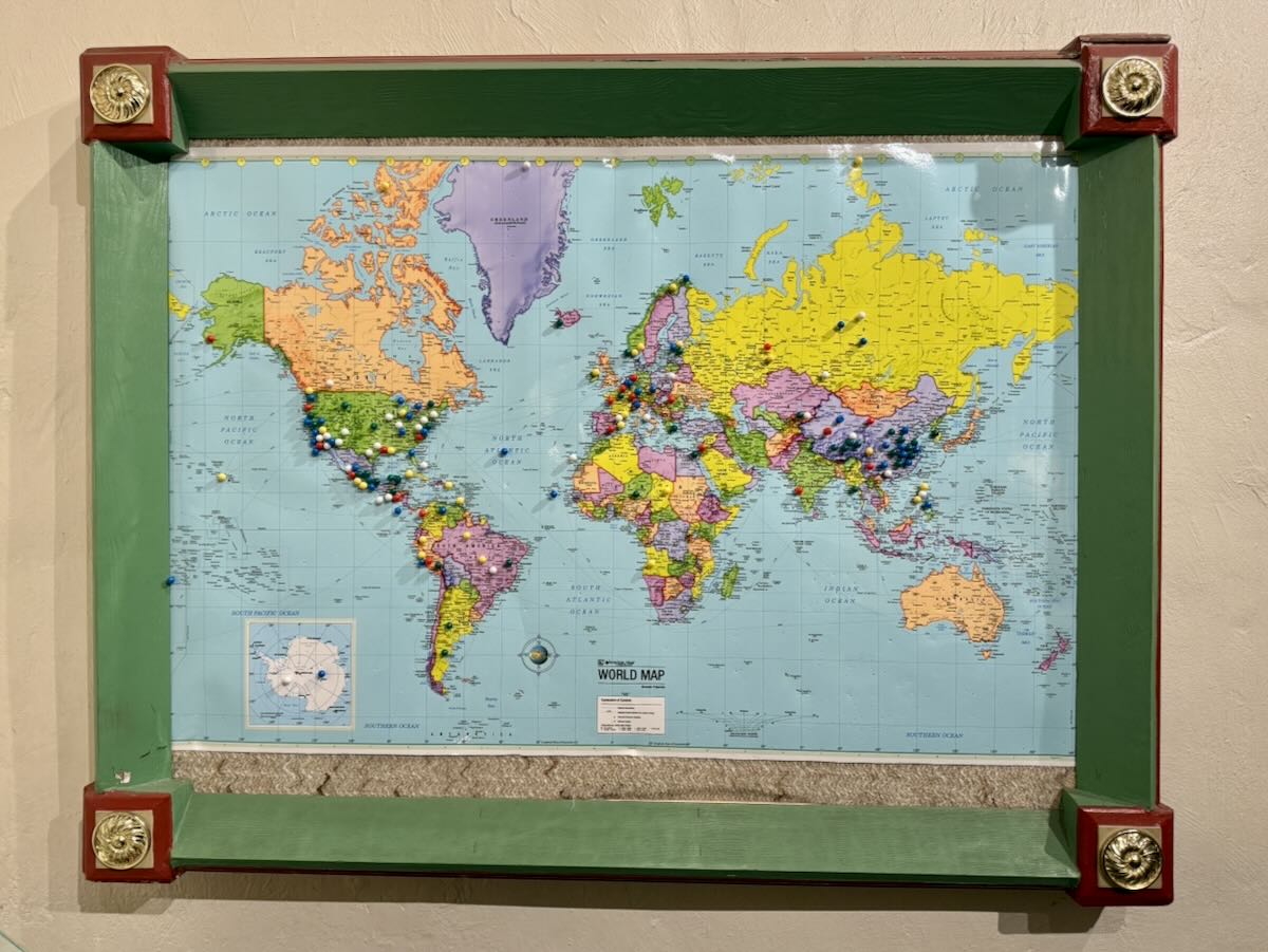 This board had no explanation of what the pins are for. We assumed visitors use them to mark their hometowns, but two from Antarctica?