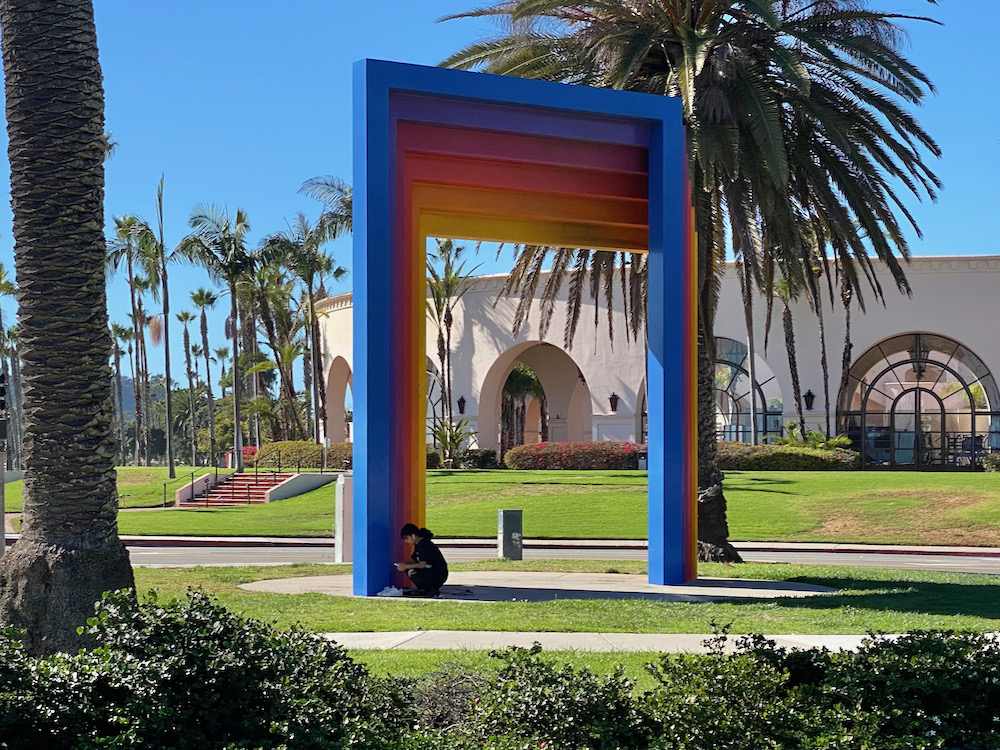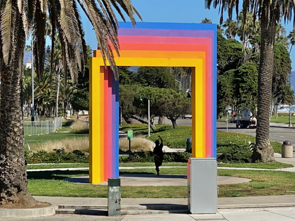 Approaching the Chromatic Gate sculpture, I wondered what the young woman huddling nearby was doing. Is there an outlet she was using to charge her phone? No! (Or at least I don’t think so.) She was preparing to practice rope tricks.