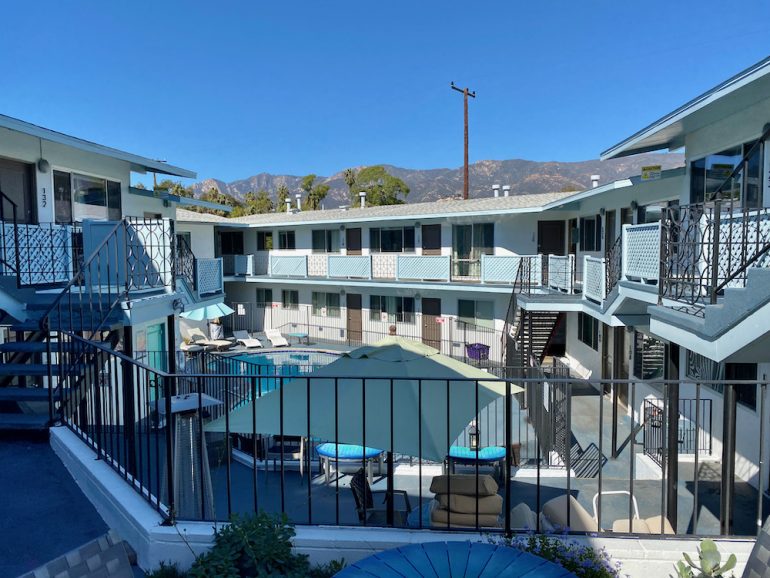 The Inn at East Beach has midcentury bones and a sexy logo. Although I had driven by it before, I never realized that the courtyard pool is way below street level. The area isn’t hilly, so I don’t know how they achieved that. Are the poolside rooms dug into the earth?
