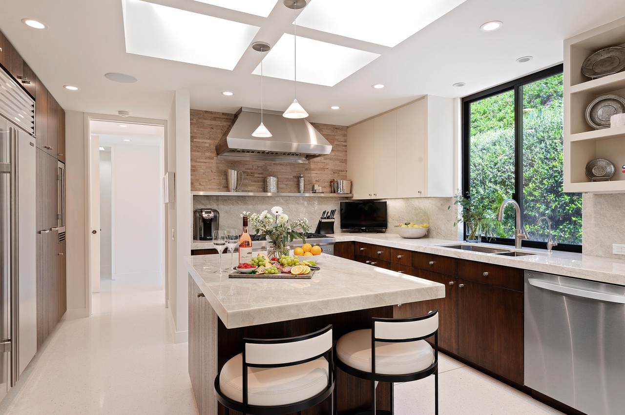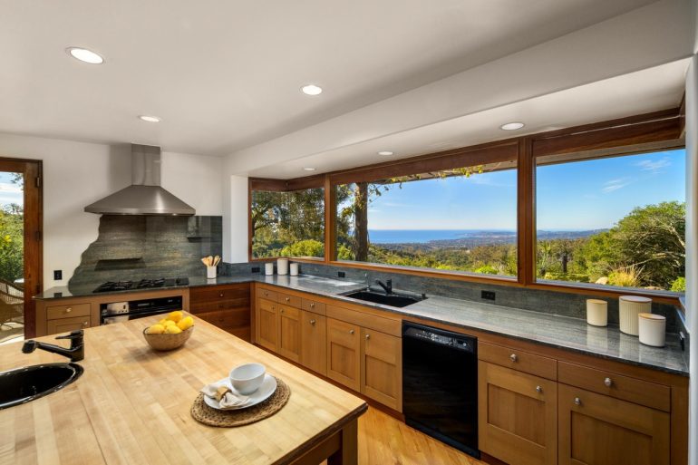 Near the far end of the street, 3035 Hidden Valley Lane ($3.595 million) is a two-bedroom, two-bath house with terrific views down toward Santa Barbara. There’s not a ton of outdoor space, and many surfaces—the carpet, the cooktop backsplash, the dining room that doubles as a library—want updating. But show me a lovelier spot to do the dishes….