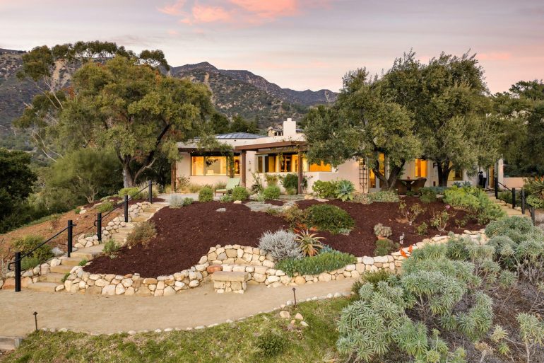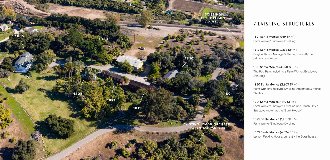 “Black Opal Ranch provides an unprecedented opportunity to own a legacy historical property,” says the listing for 21-acre 1835 Santa Monica Road ($10.995 million) in Carpinteria’s Rancho Monte Alegre community. “Amongst the working avocado orchard, the original agricultural tapestry of the ranch is preserved—historic gardens, a weathered barn, rustic bunkhouse, a lemon packing house converted into an enchanted home, and the timeless dwellings of farm workers.” The proposed new main house designed by Robin Donaldson, however, goes in an entirely different direction.