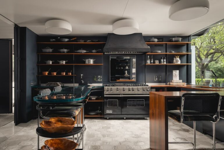 Living, family, dining, and den spaces flow outward, each room connecting directly to terraces and gardens. At the center of the home, the kitchen serves as both anchor and showpiece: a dramatic composition of moody hues and clean lines, warmed by the glow of natural light.