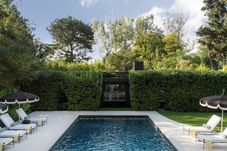 The three-bedroom, four-and-a-half-bath, custom-built main residence balances the theatrical and the serene. Light, color, and texture are orchestrated with precision, creating interiors that feel at once expressive and deeply comfortable, with vaulted ceilings, custom steel doors throughout, fabric wall treatments and Hermès wallpaper, and whimsical surfaces from Europe. It’s an aesthetic reminiscent of gallery spaces and high-end hotels.