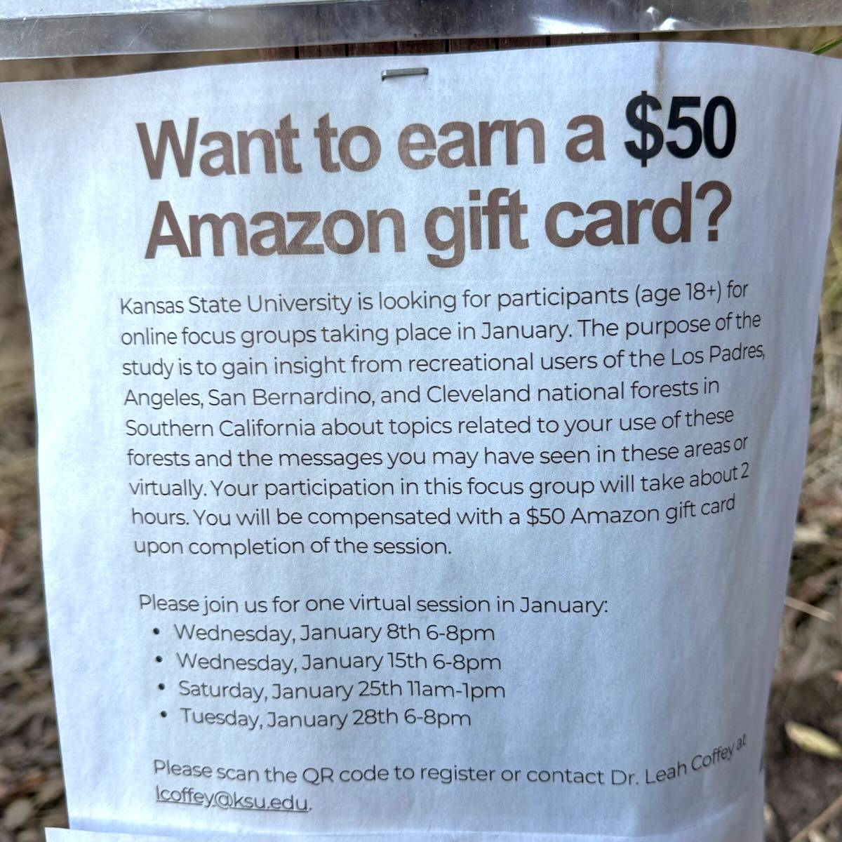 ••• I couldn’t make sense of this flyer posted at the Cold Spring trailhead, so I emailed the person doing the research, whose response didn’t clear things up all that much: “The purpose of the study is to gain insight from recreational users of the Los Padres, Angeles, San Bernardino, and Cleveland national forests in Southern California about topics related to your use of these forests and the messages you may have seen in these areas or virtually. Additionally, we aim to receive input regarding experiences, decision making leading up to hiking, and messaging about risk.” The focus groups are all booked up.