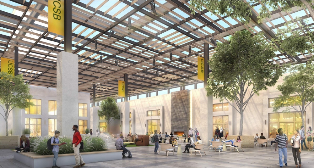 ••• “UCSB Divulges New Details on Munger Mega-Dorm […] The massive 11-story building would provide housing for nearly 5,000 undergraduate students” but the design “does not include windows for most of the dormitory’s single-occupancy bedrooms.” Boy, that’s grim. Above: a rendering of a courtyard. —Independent