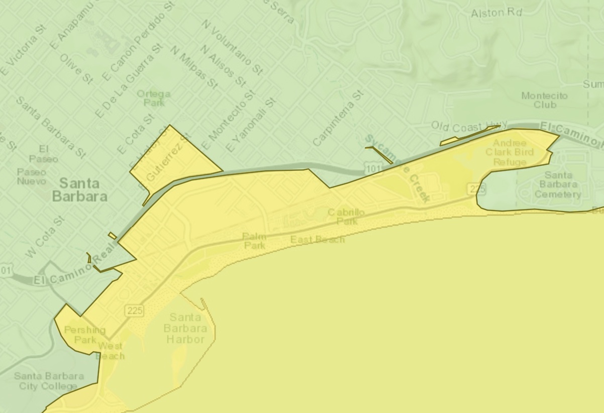 ••• “New interactive maps released by the California Geological Survey outline the Santa Barbara County areas that could be exposed to the risk of tsunami hazards.” Below: a screenshot of the main Santa Barbara area.