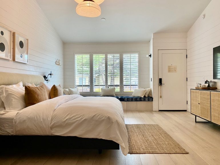 ••• One last recommendation from my recent trip up the coast: I was impressed with White Water, which opened last fall across from Cambria’s Moonstone Beach. It calls itself a lodge, which is silly, because it’s clearly a renovated motel—or actually two, with a vacant lot in between. But it was more successful than the other upgraded motels I’ve stayed at in recent years. One caveat: the rooms in our wing only had small windows in front that opened, so there’s no hope of cross ventilation (and no air conditioning); inexplicably, a window in the shower that could’ve solved the problem had been sealed shut. You just can’t overvalue fresh air in a hotel room.